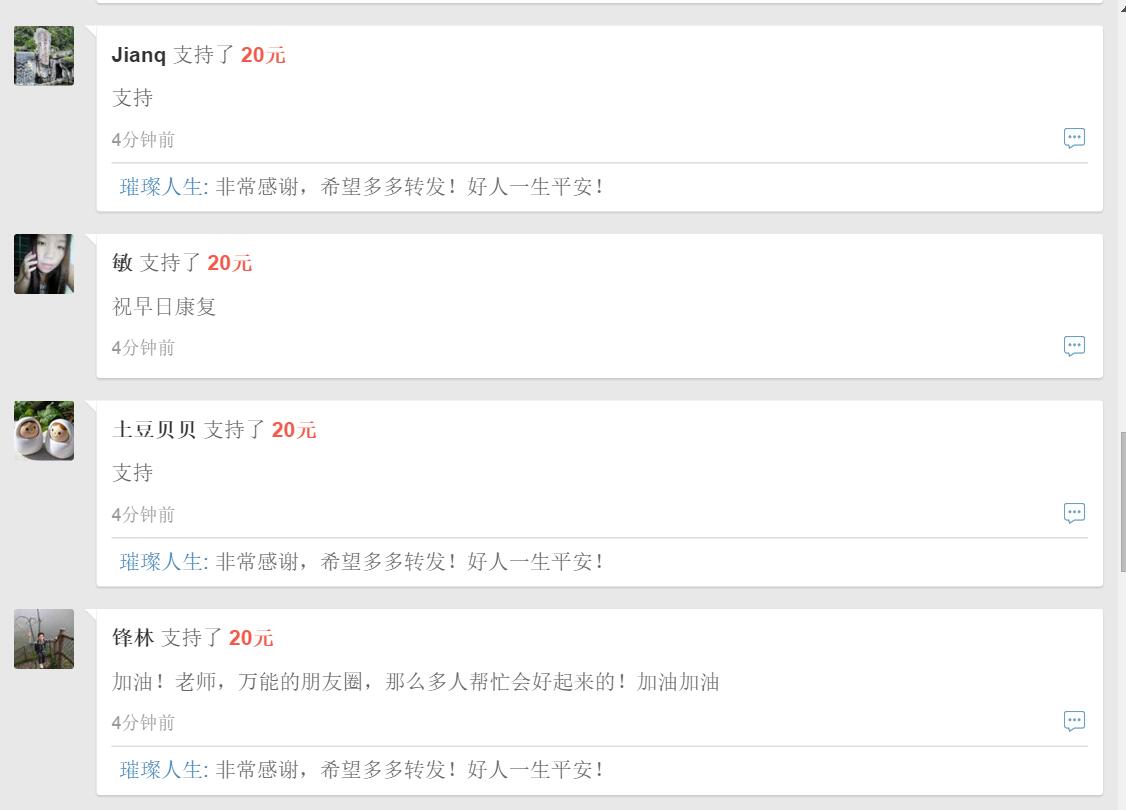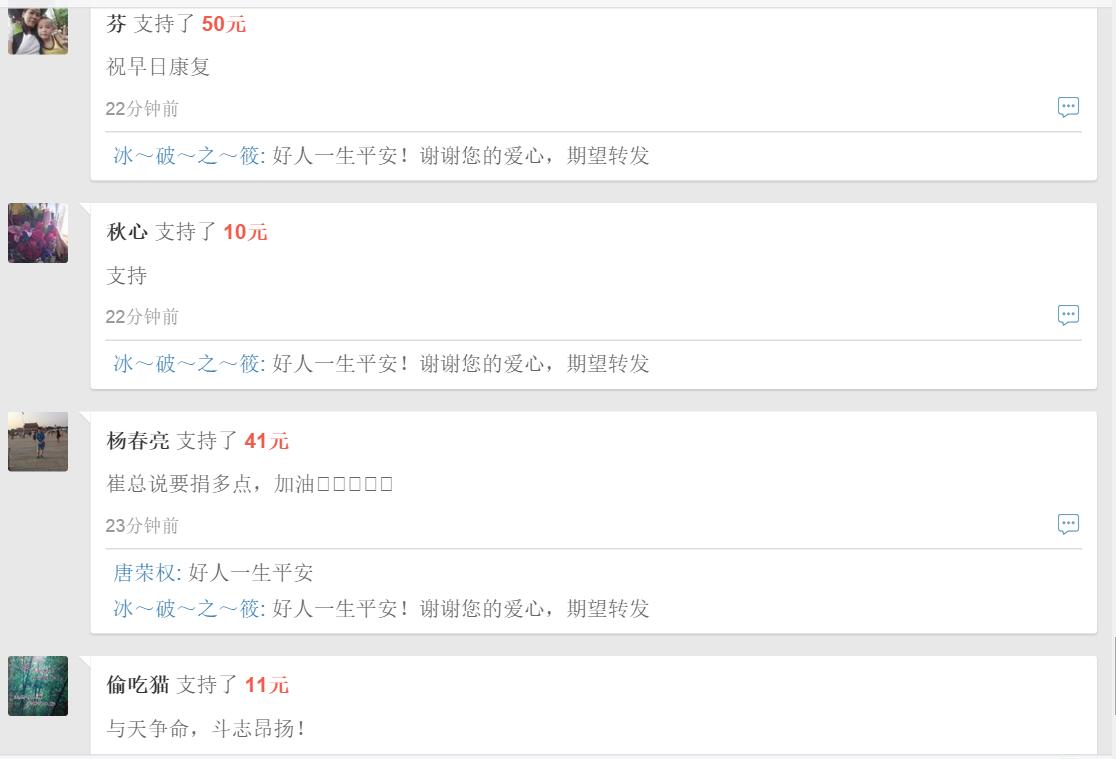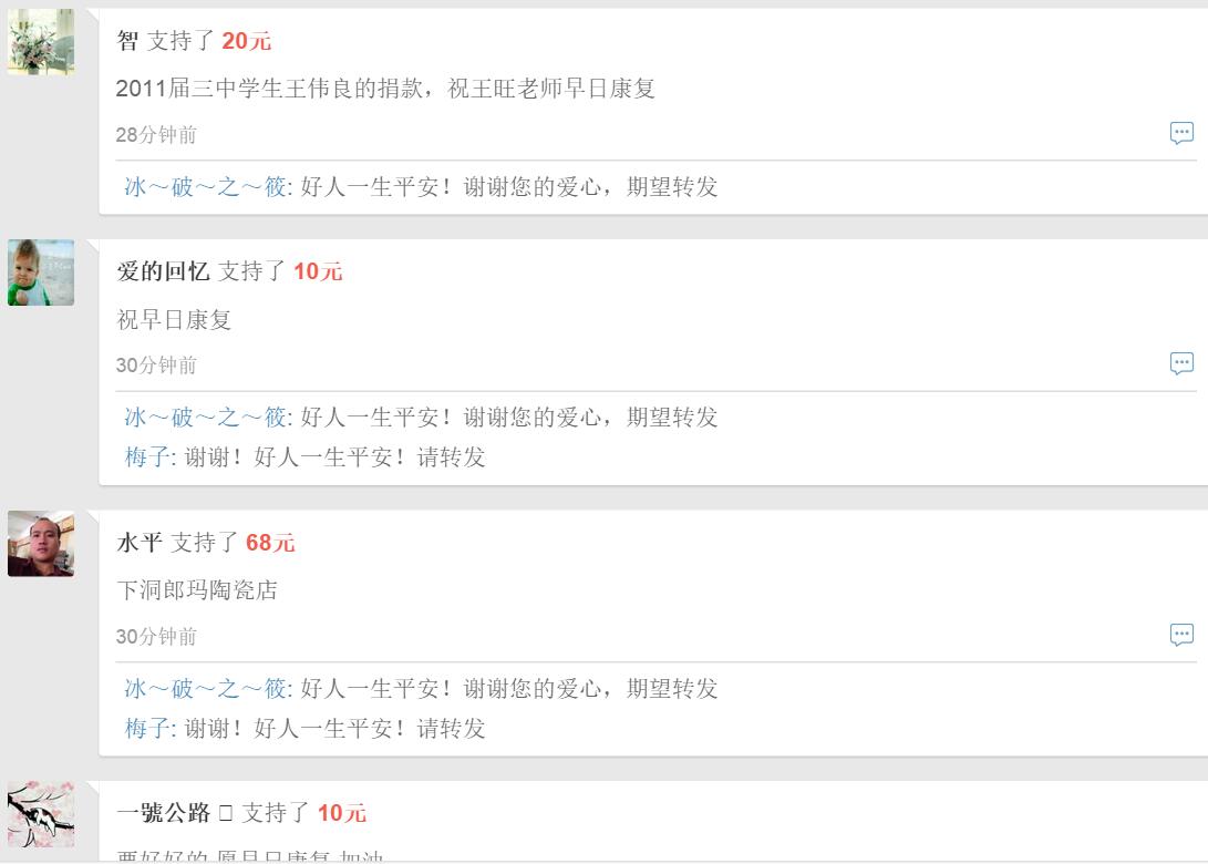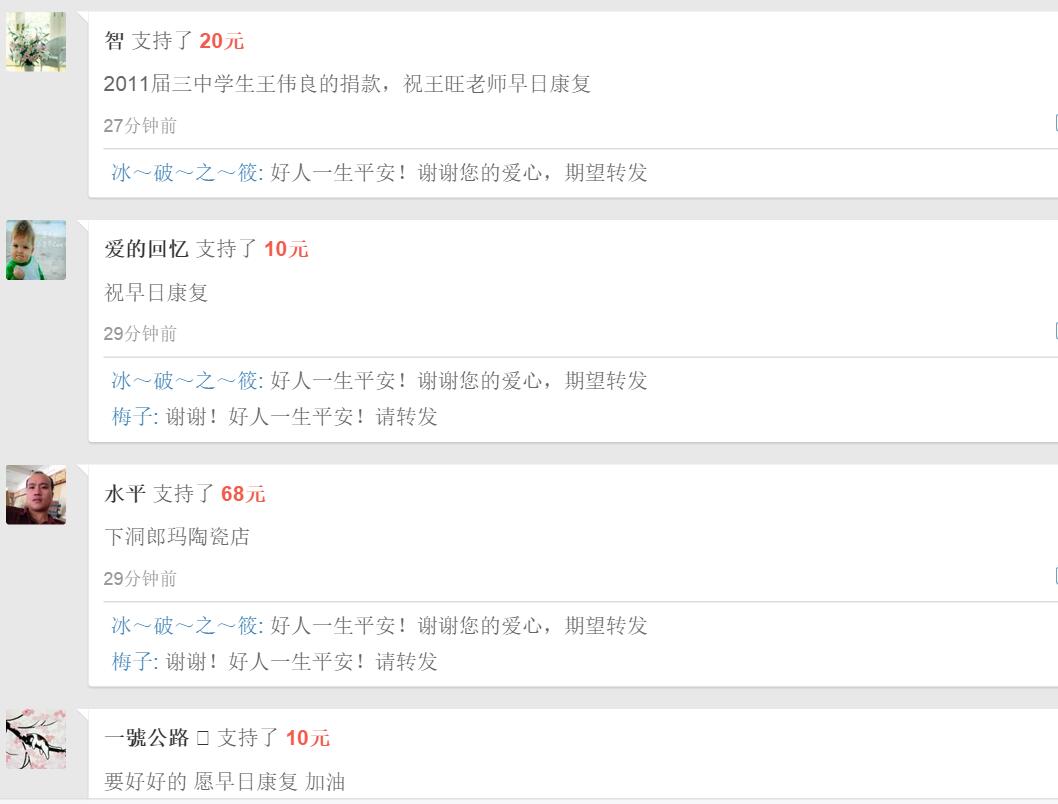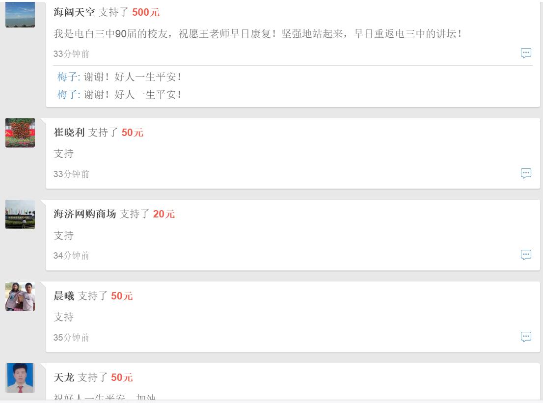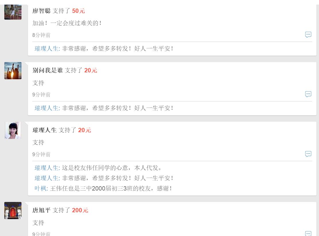众筹平台从早上开通到现在,一共接受了五百多热心人士的捐款,暂筹资金27682.53 电白三中许多老师自发为王老师在自己朋友圈和同学群里转发,还有王旺老师曾经的学生・・・・・・以下是在众筹平台截图 人太多就不一一截了,以下是链接大家都可以进去关注一下。 http://m.qschou.com/project/4c79e852-be1f-...echat&shareto=2