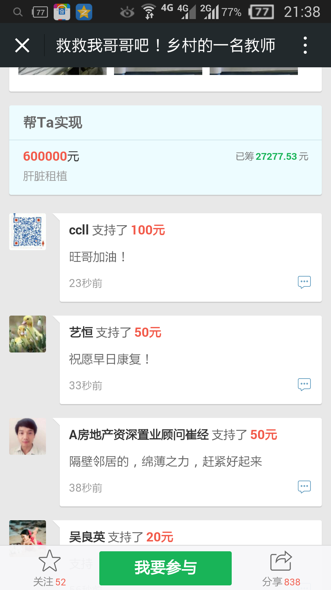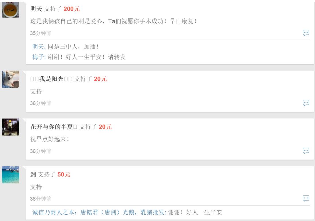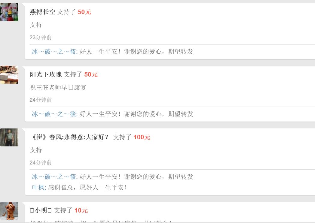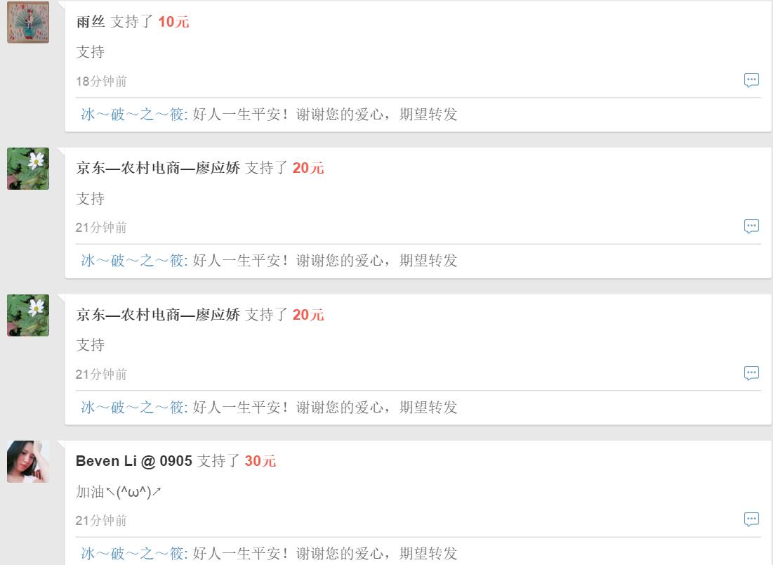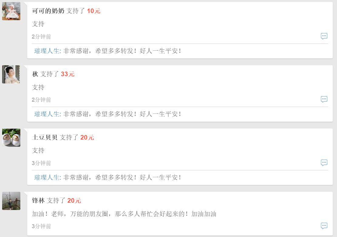 众筹平台从早上开通到现在,一共接受了五百多热心人士的捐款,暂筹资金27682.53 电白三中许多老师自发为王老师在自己朋友圈和同学群里转发,还有王旺老师曾经的学生・・・・・・以下是在众筹平台截图 人太多就不一一截了,以下是链接大家都可以进去关注一下。 http://m.qschou.com/project/4c79e852-be1f-...echat&shareto=2