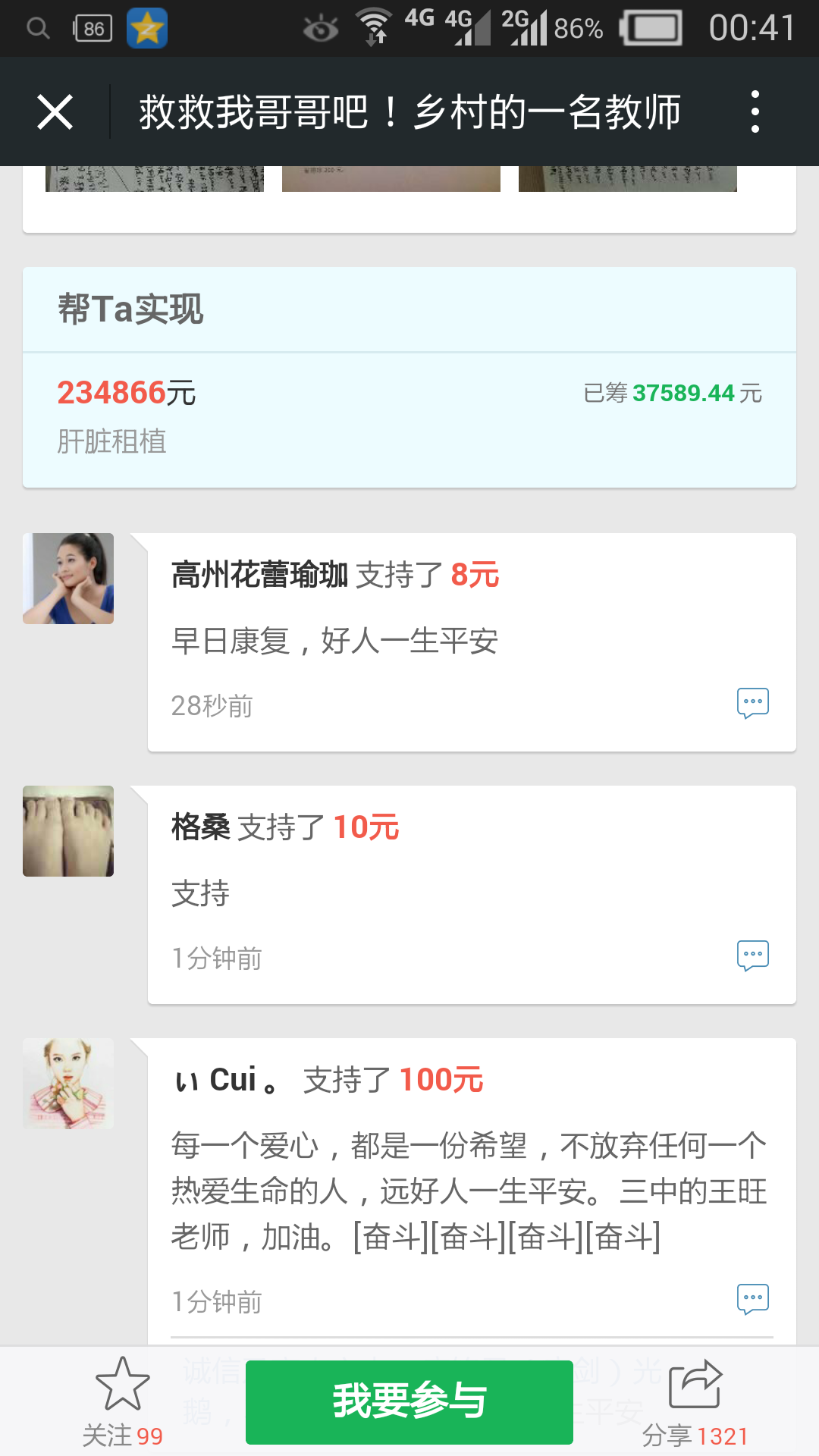 已通过上面发的轻松筹网址进去表心意,不到一天时间筹了一万多,大家的爱心是源源不尽的。不过离60万的费用还相差很大,希望大家继续转发,有钱出钱,有朋友圈就转朋友圈。哪怕是一分的爱,也会聚成拯救的海洋!旺哥挺住!!