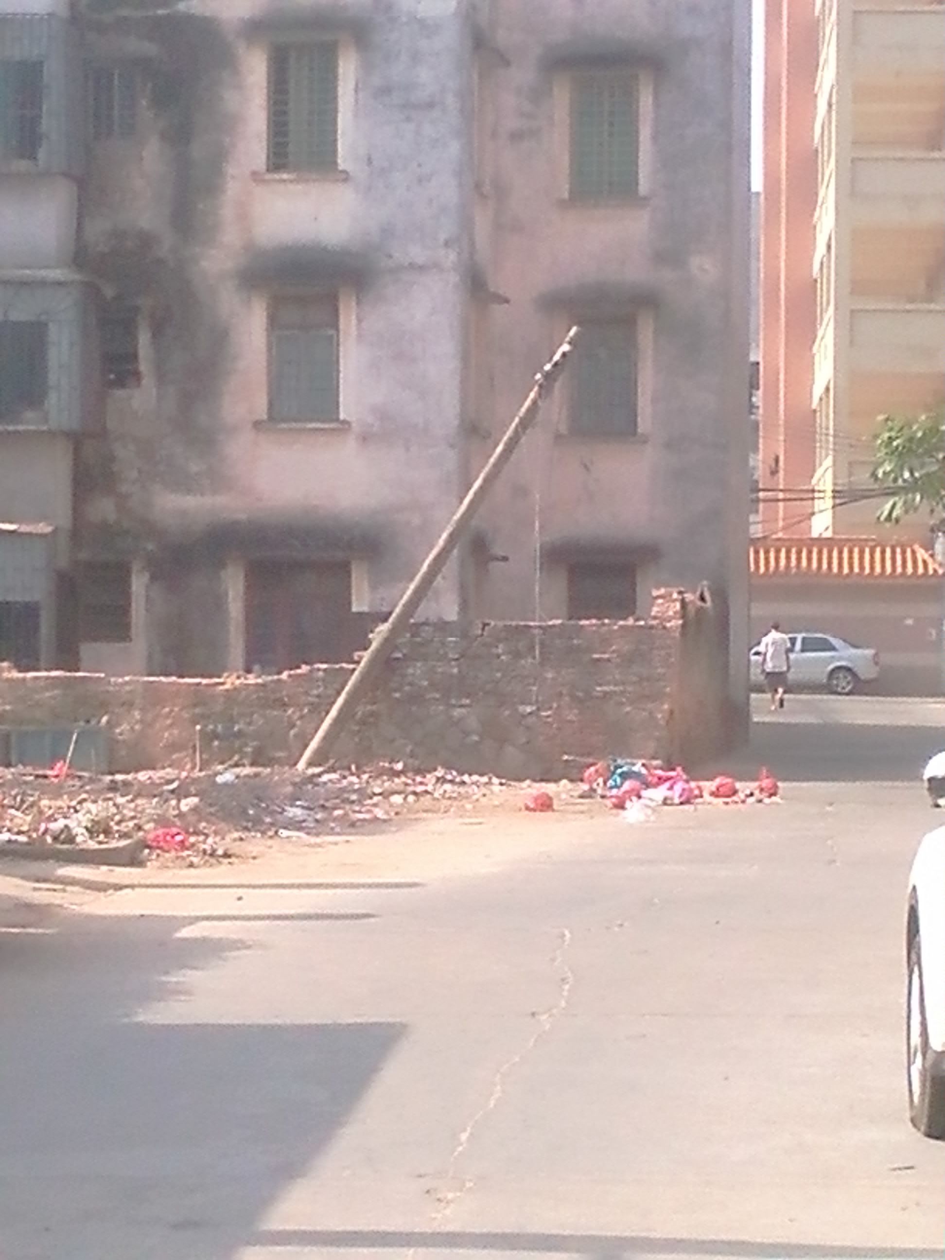 这一根电线杆,孤零零地、摇摇欲坠、将倾未倾地毫无支撑地跪在一面断墙边,我小心翼翼地浑身是汗地从那里经过,我不知道它会不会突然倒下会不会刚好砸到我或砸到其他人,我只知道,如果不妥善处理这根电线杆的话,它一定会毫无征兆地倒下,如果刚好砸到人的话…… 这已不是隐患,这是如假包换的显患,但凡智商稍微正常的人都可以一眼看出,这根电线杆很危险,很刺眼的危险! 不知电白城管有没看到这个危险?如没看到,就由我带下路吧:电白中学跟科委幼儿园交界处,即科委幼儿园路口往电白中学方向附近。