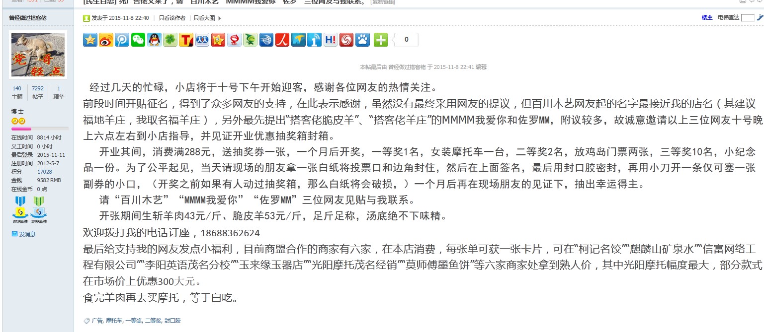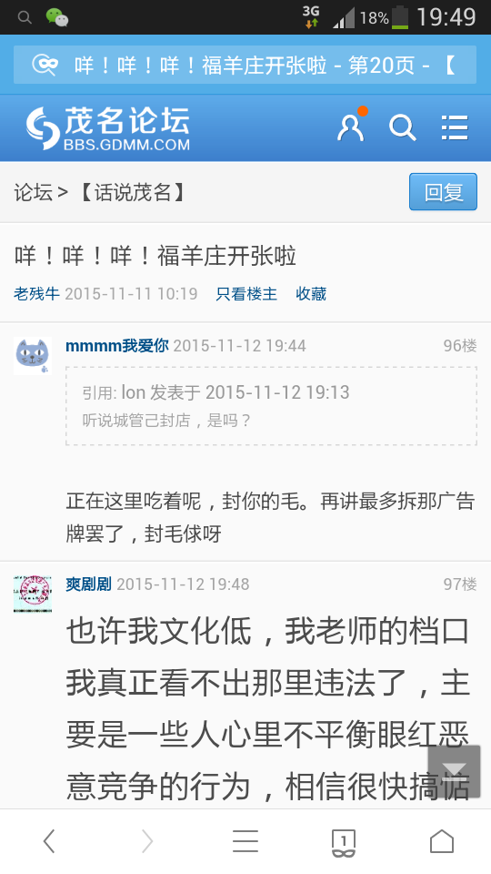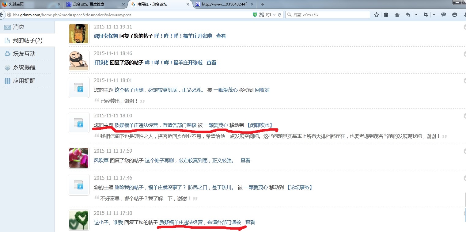 11月11日,本人将该羊庄涉嫌违法经营行为在“茂名论坛”发帖,由于该羊庄的经营者”搭客佬“是”茂名论坛”老板,即著名的“一颗爱茂心”的铁哥们,“一颗爱茂心”对此事进行偏袒。对帖子进行转移、回收,企图化解危机。
