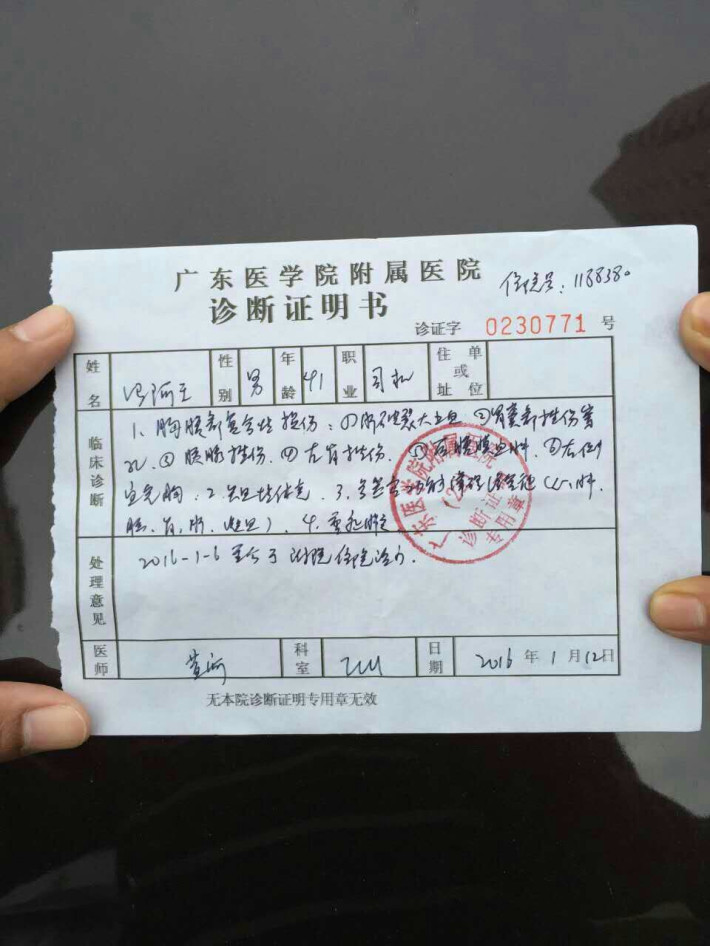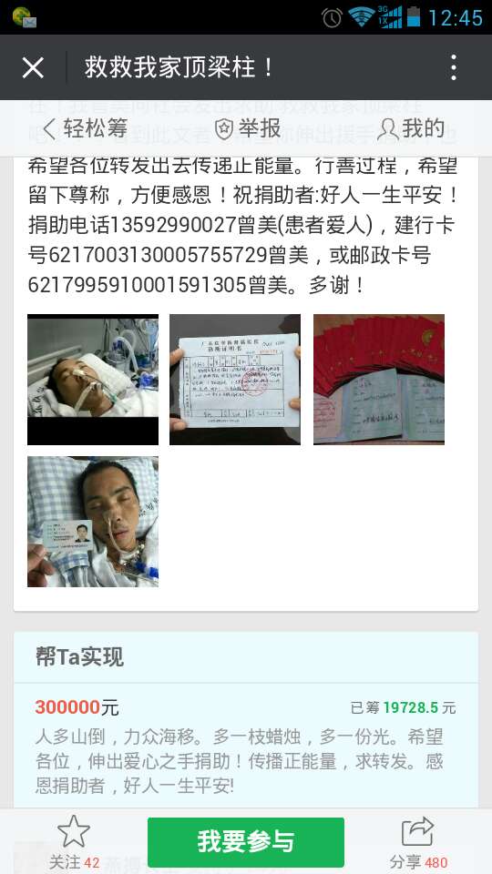 无情灾难发生在2016年1月5日,丈夫驾车为了避让骑车者,在吴川覃巴路段撞向公路中间水泥隔离带,致使车辆冲击力过大,方向盘反弹撞伤腹腔,导致肝裂、脾出血、肠胃穿孔。得知这噩耗我瘫痪无力。当天因大量出血,在吴川急需手术,后情况危重急转湛江附属医院。现在危重病房抢救中,未脱离生命危险期(冯阿壬,7床),每天过万医疗费用和4680元外购药(人血蛋白、卡泊芬净、替加环素),本来拮据的家庭更是雪上加霜!事情发生后,我在亲戚朋友、村中邻居东凑西借,仍是杯水车薪。现在已欠下医疗费用3万多元,后续医疗费用仍无着落!