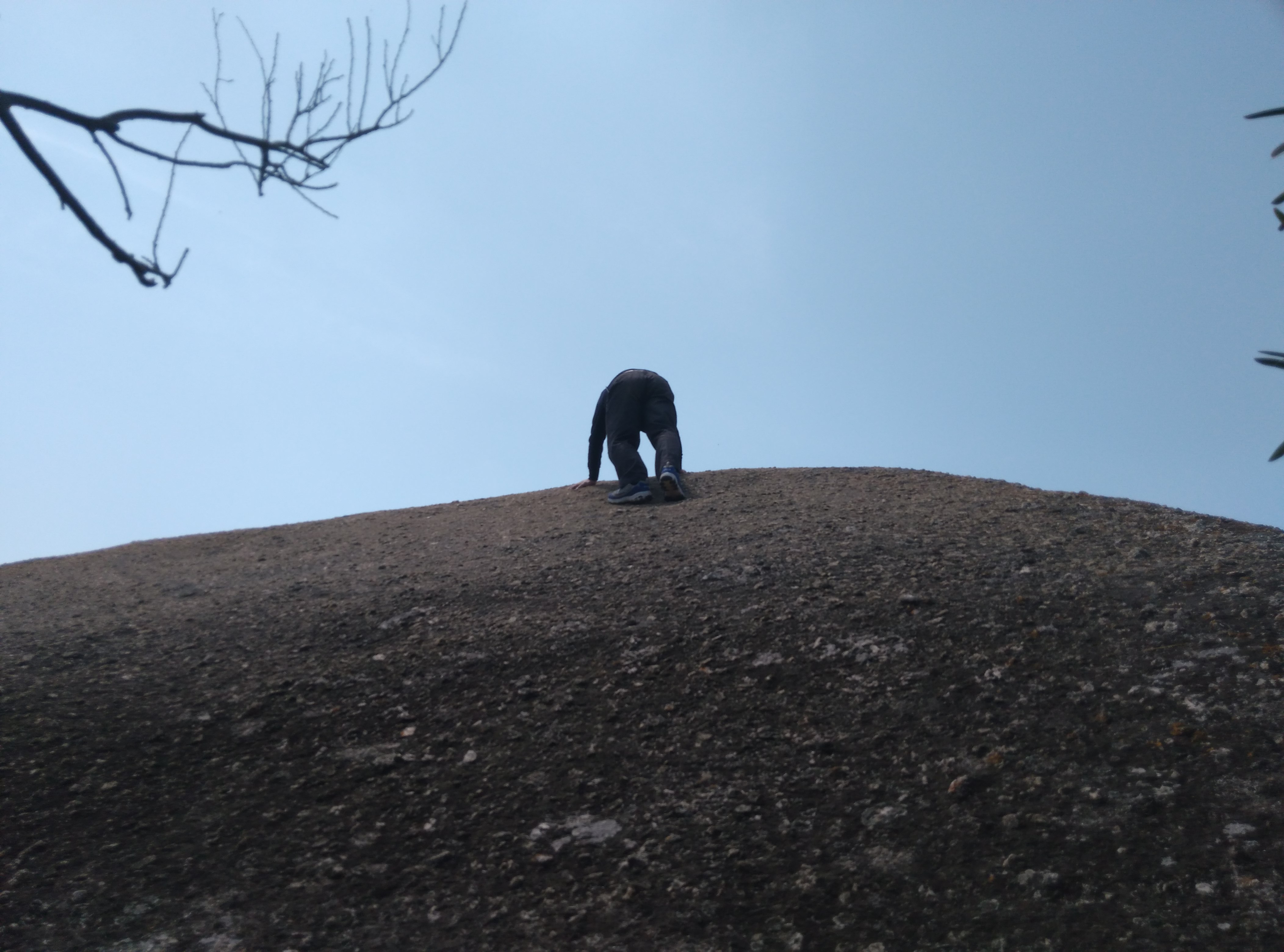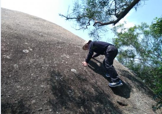另一同事用四肢如熊攀而上几至顶,伸头仍不可见字,只见前有人工凿出的几个小方坑,或为雕刻师刻“山水可人”而安装安全设备用,但用手机拍下视频即回。其间我早已经站在适当的位置,以备需要时接应。
