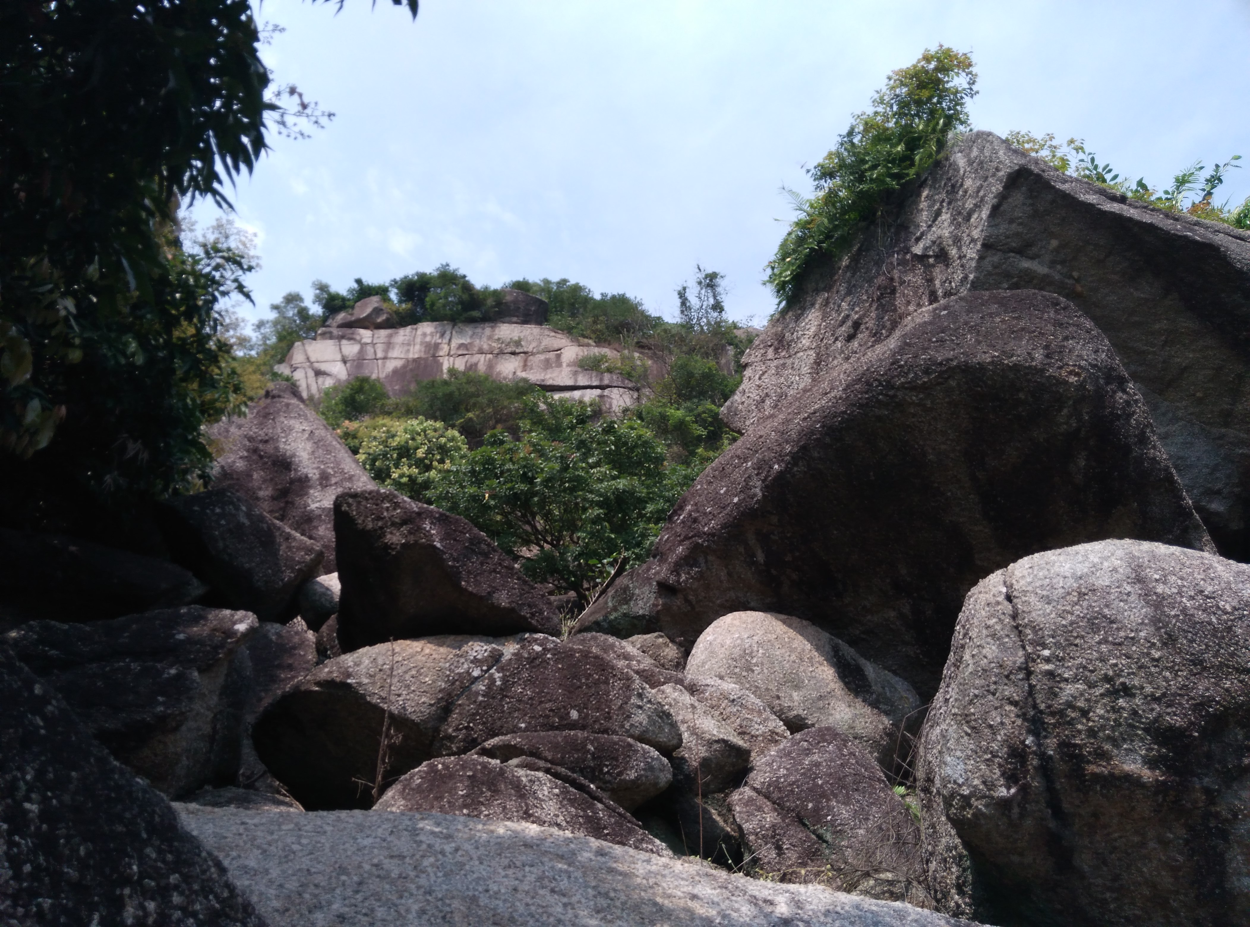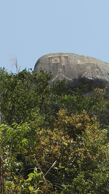 过尽一峰,才知更有一峰。经一人工荔枝林边,仰望,四字较清楚,然似乎四字笔画似看不出来粗细,“可”字不见钩,笔画较直,不事雕饰,似因山顶刻石的原因。