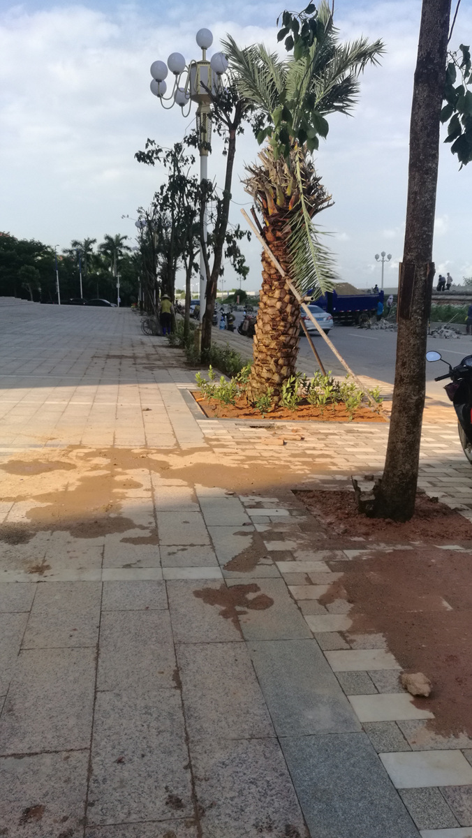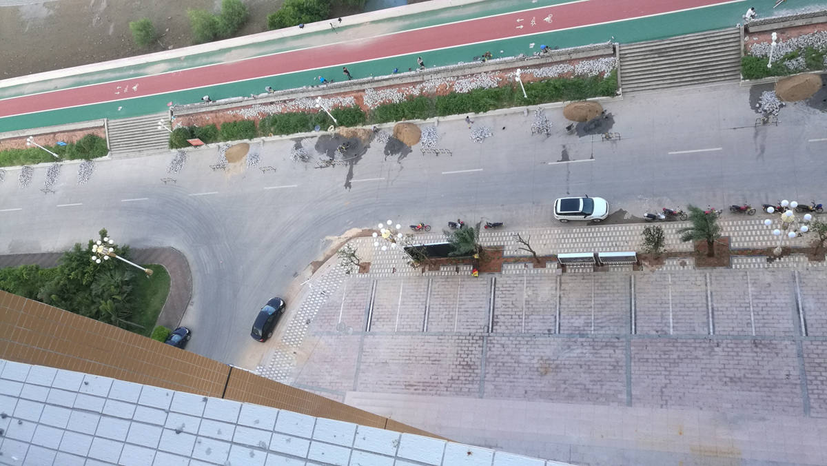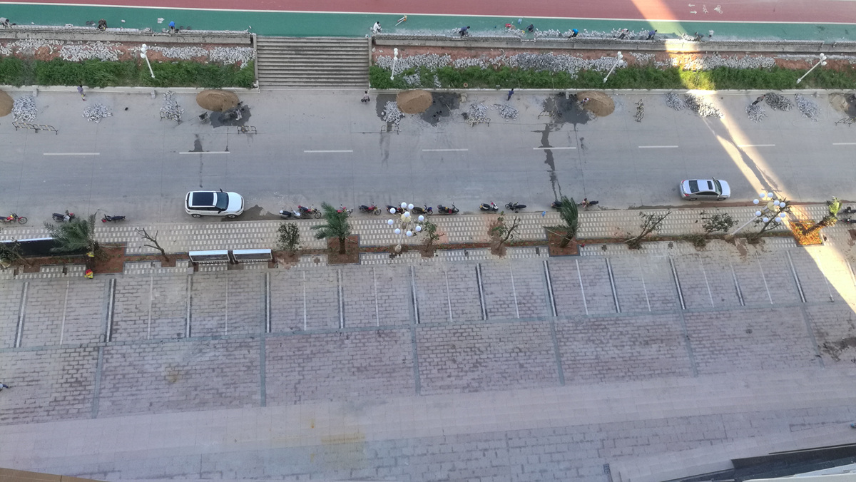 上图 东面是聚龙湾,西面是海景湾酒店,聚龙湾与海景湾离路面6米皆为绿化带,应该是政府统一规划的,怡景湾铺好地砖画好线做为内部停车场,收费保安亭已建好,还差围墙还没立起来。很明显是占用了绿化带为己用,怡景湾的车位可金贵了,15万元一个起。