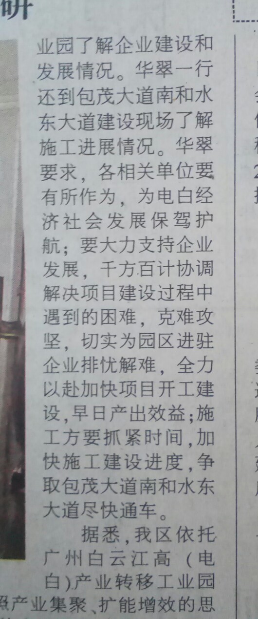 无意看了篇电白新闻报纸,见到瓦们的靓仔书记与靓女区长各自在工业园各个企业各个施工路段实地检查施工状况、、等,看来靓仔靓女书记与区长挺关心电白水东交通状况,虽瓦没亲眼目睹现场,但瓦也要稳食也没得闲驾辆摩托无事四处乱走(诂计这些图片不会作假吧?)希望能在他她们的关注下,能尽快畅通各路段,呵呵路通财通,同时也希望他她们也关心关注电白下面各乡镇的交通路况等!