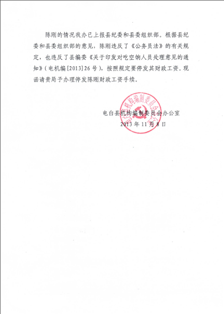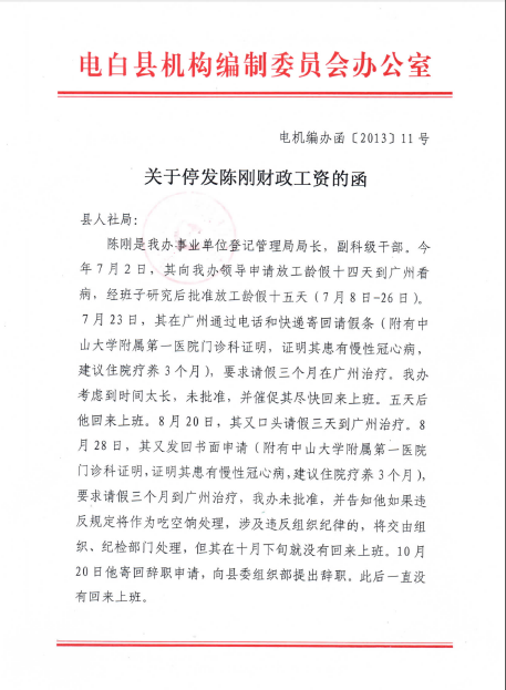 2013年12月7日原电白县编办在《茂名日报》A2版刊登通知,要求陈刚按时回单位上班,逾期不归,将按相关规定处理,并多次与其电话联系,均无音讯。