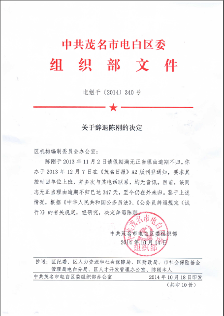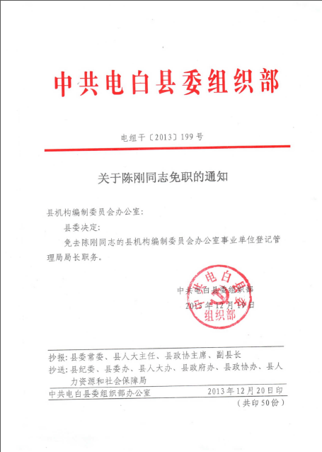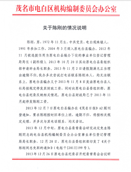 2013年12月中旬,原电白县委常委会研究决定免去陈刚同志的电白县机构编制委员会办公室事业单位登记管理局局长职务,12月20日,原电白县委组织部印发了《关于陈刚同志免职的通知》(电组干[2013]199号)。
