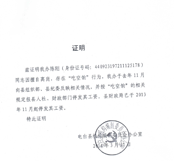 陈刚,男,1972年11月生,中共党员,电白观珠镇人,1991年参加工作,2004年3月调入原电白县编办,2012年11月被选拨任用为原电白县编办下设的事业单位登记管理局局长(副科级)。2013年10月20日其向原电白县委组织部申请辞去局长职务。2013年11月2日请假期满无正当理由逾期不归,我办多次尝试打电话联系陈刚本人,均无法联系上。原电白县编办又于2013年11月8日发函原电白县人社局按规定停发其财政工资,同时向原电白县委组织部、原电白县纪委反映相关情况。原电白县财政局已于2013年11月起停发陈刚工资。