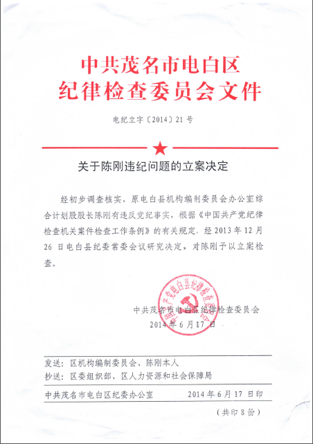 2013年12月26日原电白县纪委召开纪委常委会会议研究决定,对陈刚予以立案核查。