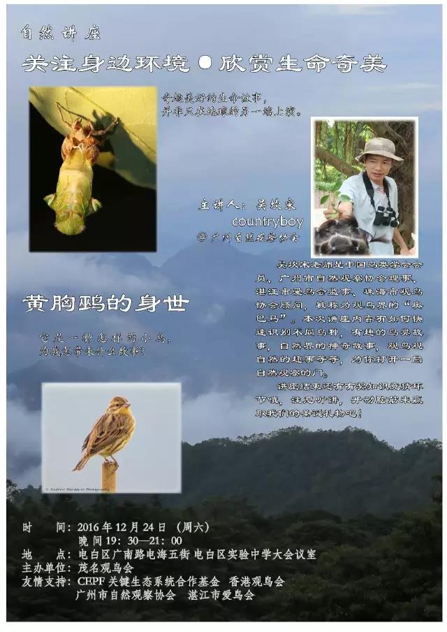 吴坎宋老师是中国鸟类学会会员、广州市自然观察协会理事、湛江市爱鸟会监事、珠海市观鸟协会顾问,被称为观鸟界的“奥巴马”。本次讲座内容有如何快速识别不同鸟种,有趣的鸟类故事,自然界的神奇故事,观鸟观自然的趣事等等,为你打开一扇自然观察的门。