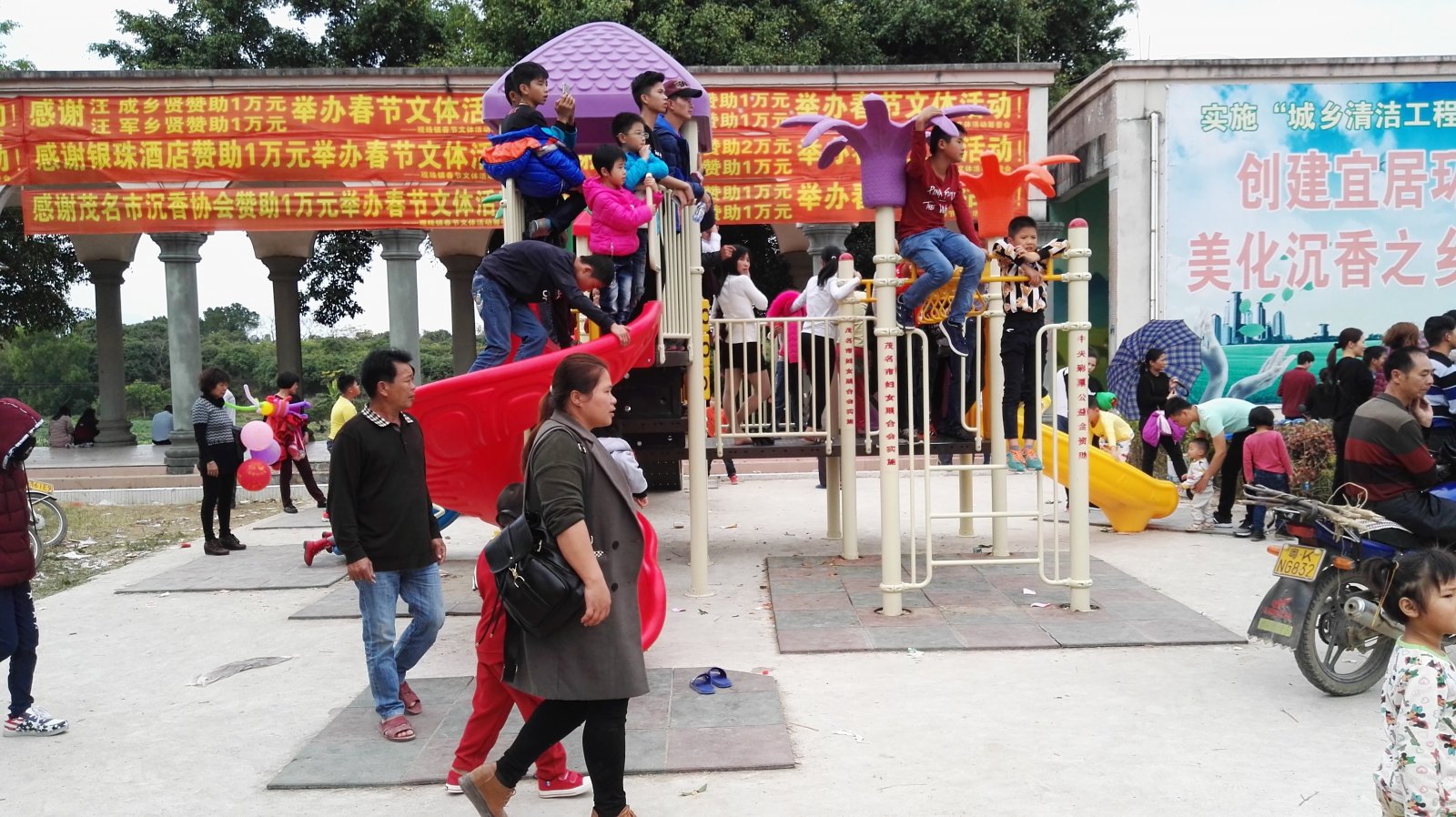 楼主所言极是,瓦今天跟了朋友四轮车去了趟罗坑水库,走旧路沿路途经几个镇,的确热闹非凡,特观珠那广场不知搅什么活动人来人往围观,在开动的车里拍一两张: