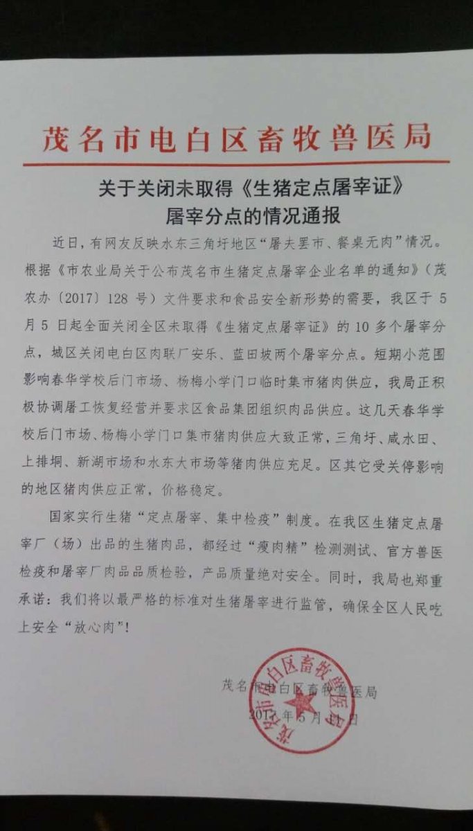 近日,有网友反映水东三角圩地区“屠夫罢市、餐桌无肉”情况。根据《市农业局关于公布茂名市生猪定点屠宰企业名单的通知》(茂农办〔2017〕128号)文件要求和食品安全新形势的需要,我区于5月5 日起全面关闭全区未取得《生猪定点屠宰证》的10多个屠宰分点,城区关闭电白区肉联厂安乐、蓝田坡两个屠宰分点。短期小范围影响春华学校后门市场、杨梅小学门口临时集市猪肉供应,我局正积极协调屠工恢复经营并要求区食品集团组织肉品供应。这几天春华学校后门市场、杨梅小学门口集市猪肉供应大致正常,三角圩、咸水田、上排垌、新湖市场和水东大市场等猪肉供应充足。区其它受关停影响的地区猪肉供应正常,价格稳定。