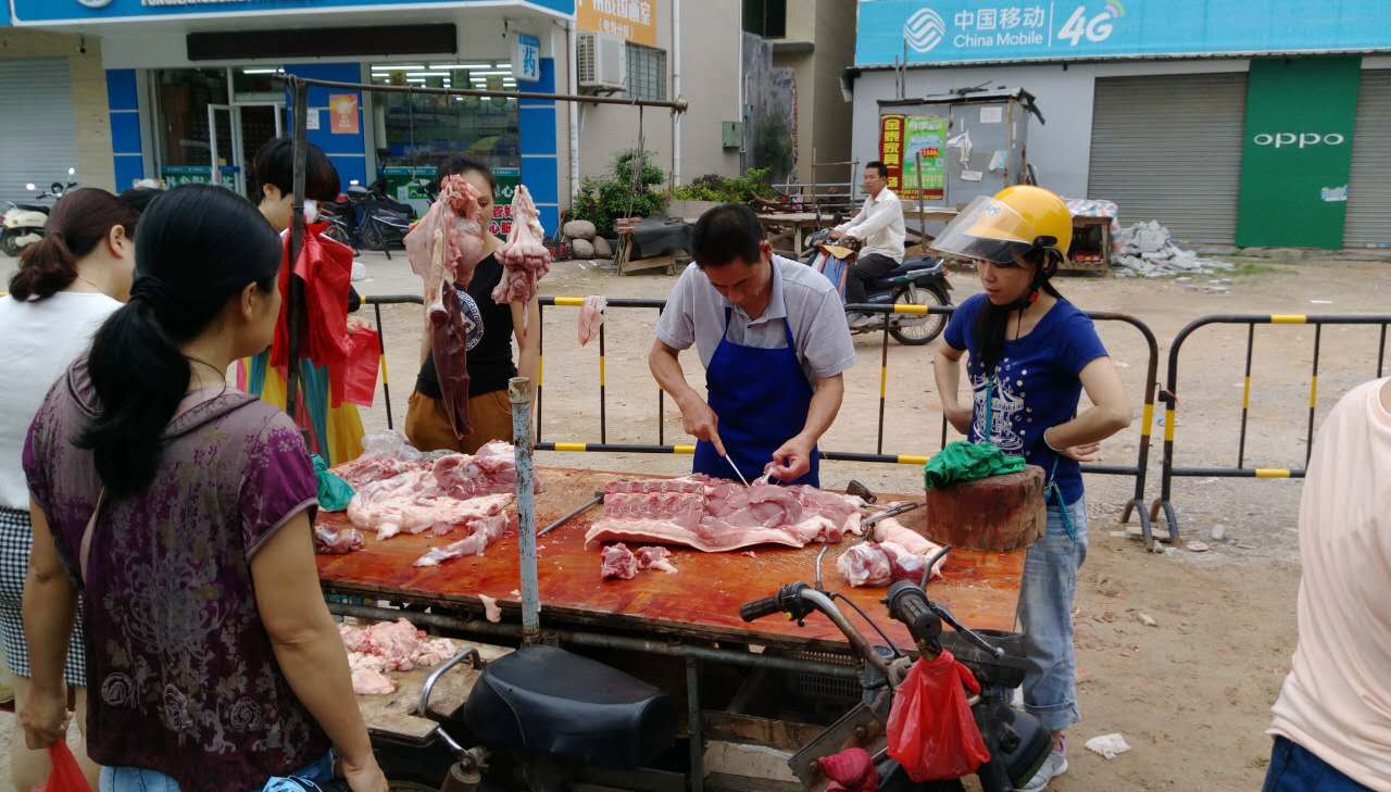 5月12日杨梅小学门口临时集市猪肉供应充足。(区畜牧兽医局摄)