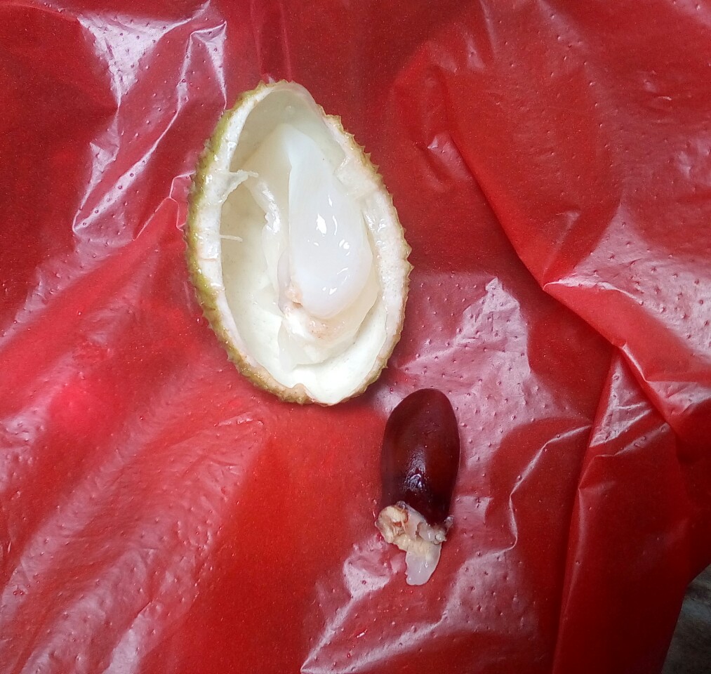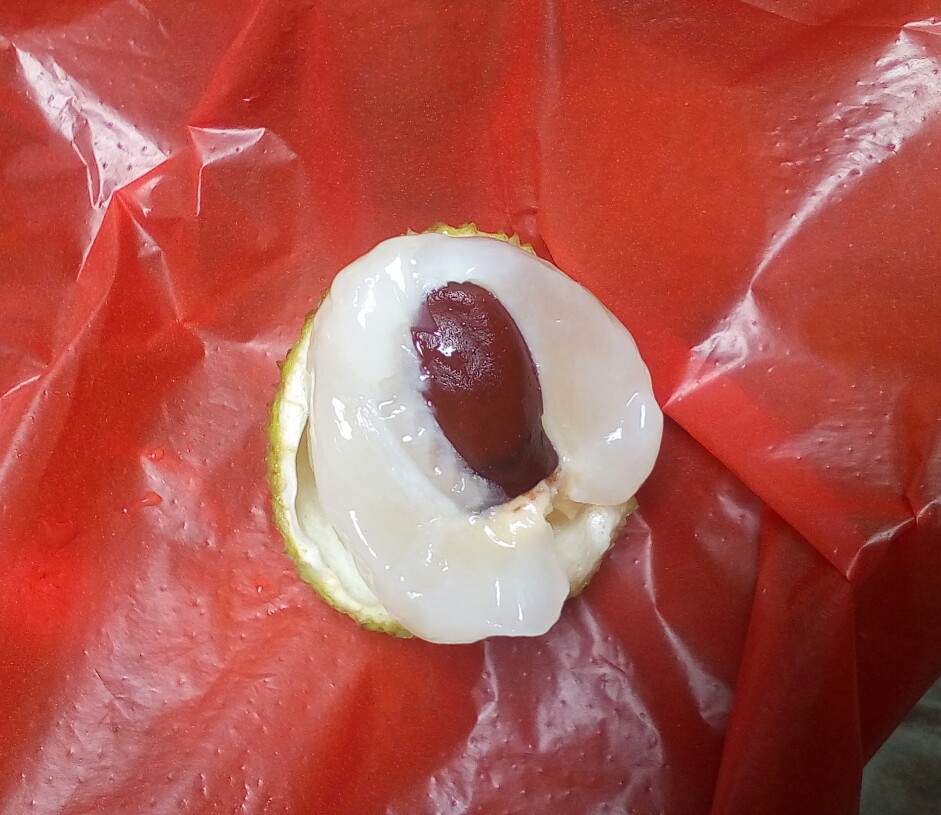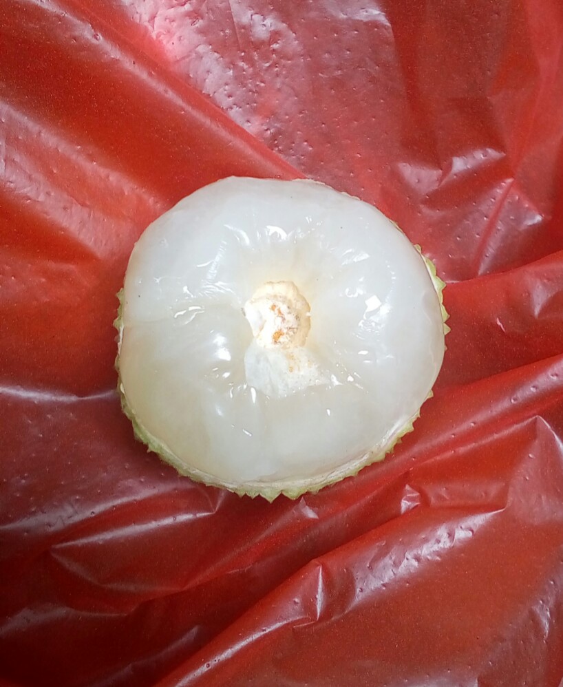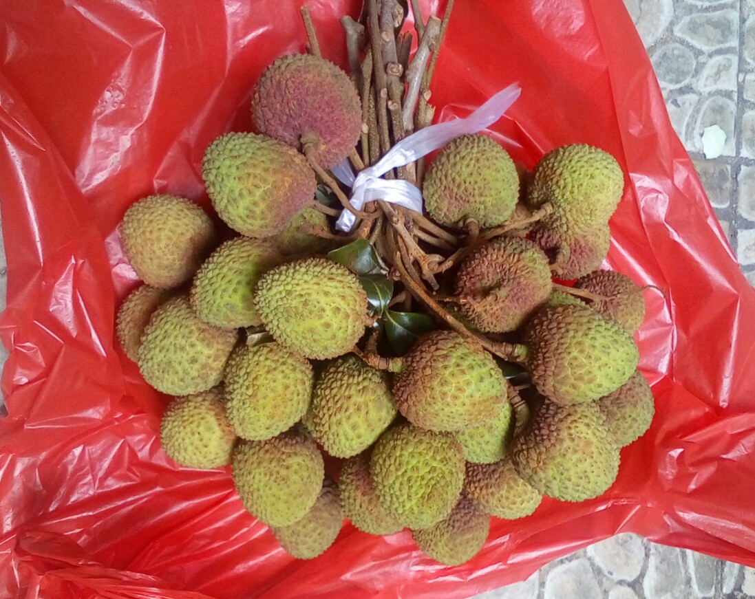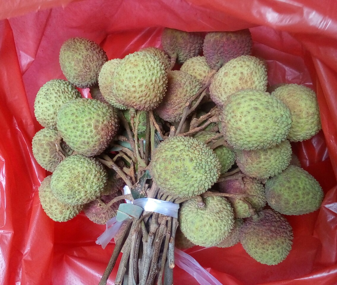 途经见摆在地上,青绿色,有点特别,走近问下女档主,她说是自家树种的,趁墟进城顺摘点卖,问什么什荔枝,拟说是妃子笑,再问多少钱一斤,言十二块,看了也没剩多少,就问平宜点,她说买光吗?我笑了笑心想买光那要多少钱呀,就说只买点试试,她就说十块买点给你,她拿了一把大的,我赶急说,买最小把的,并说卖那么大把的,我不够钱给你哦~~