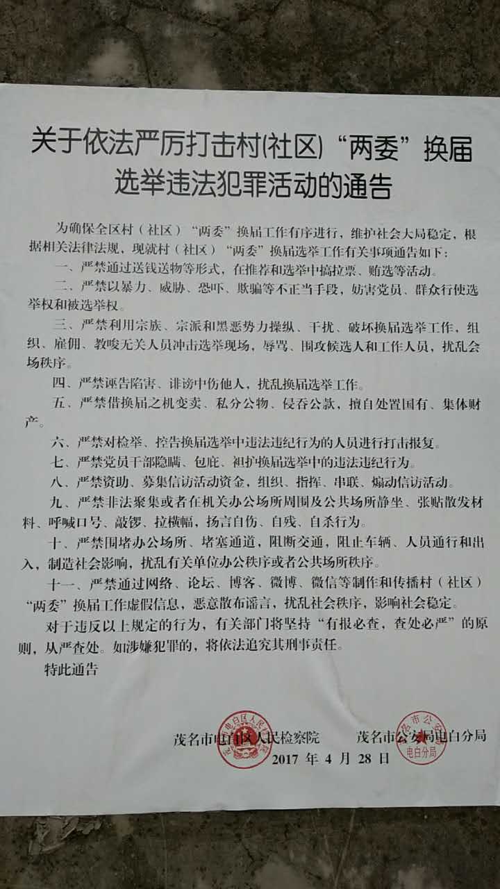 如果我们农村老百姓连我们自己的心中的父母官都不能公平公正的选出来,还谈什么安居乐业?我们老百姓盼望的是帮帮我们老百姓办事说话的好官,真真正正里当为公执政为民的官!而不是鱼肉百姓的官!何为选举法?茂名市的领导们?有钱就有法了吗?