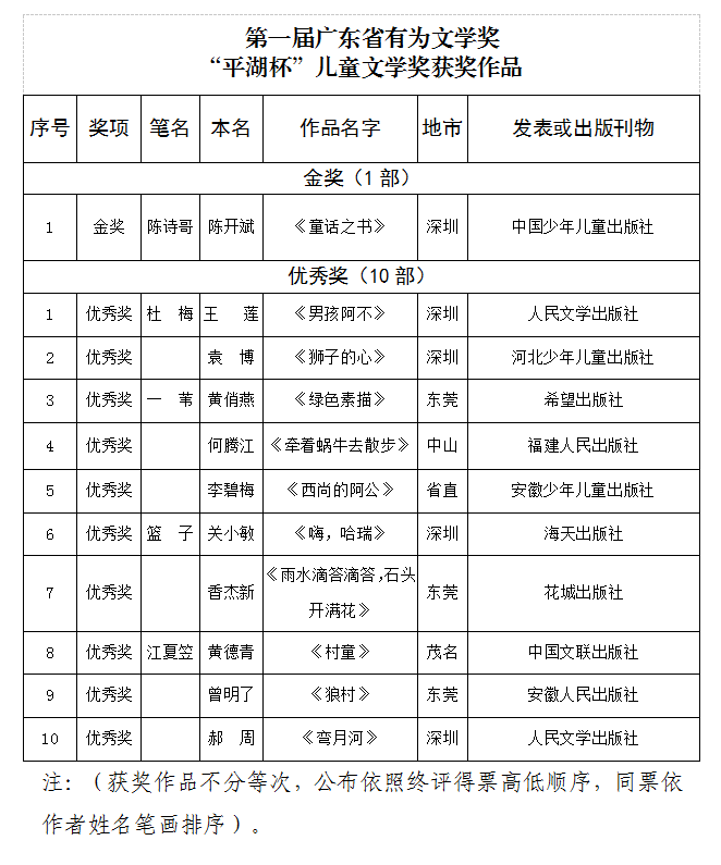 第一届广东省有为文学奖“平湖杯”儿童文学奖每位评委认真阅读了全部作品,每个评委独立对所投作品写出评审意见,经过初评1轮、终评3轮投票,按征稿公示所列名额选出金奖1部、优秀奖10部(篇)作品。投票全程在纪律监察组监督下进行,所有评委对评奖结果签名确认,评奖全程拍照存档。