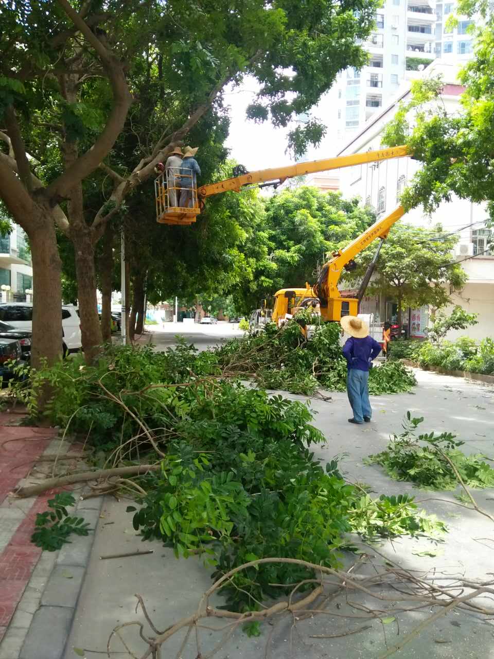 8月19日,电白城管局路灯所配合园林所抓住周六日时间加班加点按计划推进海滨四路等横街、和埗头路等城中村道路绿化树的枯枝清理、矮化、修剪等维护管理工作。