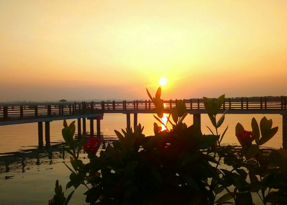 很美栈道就是红红火火的红色嘛,如身在其中,发挥下想像力嘛,天是蓝,水与红树林是绿,栈道是红,晨早与傍晚在红太阳照耀下就是红色嘛