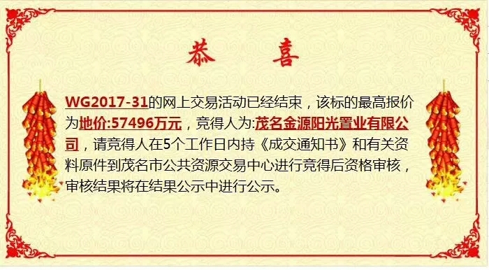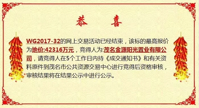 我系良民 小学四年级 注册 2014-06-18 消息 271 反馈评分 30 点数 11 2017-12-15 #7 据茂名买房网得到的消息,位于市民片区的两幅限价地今天成功摘牌!由茂名金源阳光置业有限公司成功投得,总成交金额接近10亿,溢价率超过48%! 附件 mmexport1513334692744.jpg 234.5 KB · 查看: 826 mmexport1513334695986.jpg 228.7 KB · 查看: 780 mmexport1513334706279.jpg 299.5 KB · 查看: 854 mmexport1513334710413.jpg 275.3 KB · 查看: 794