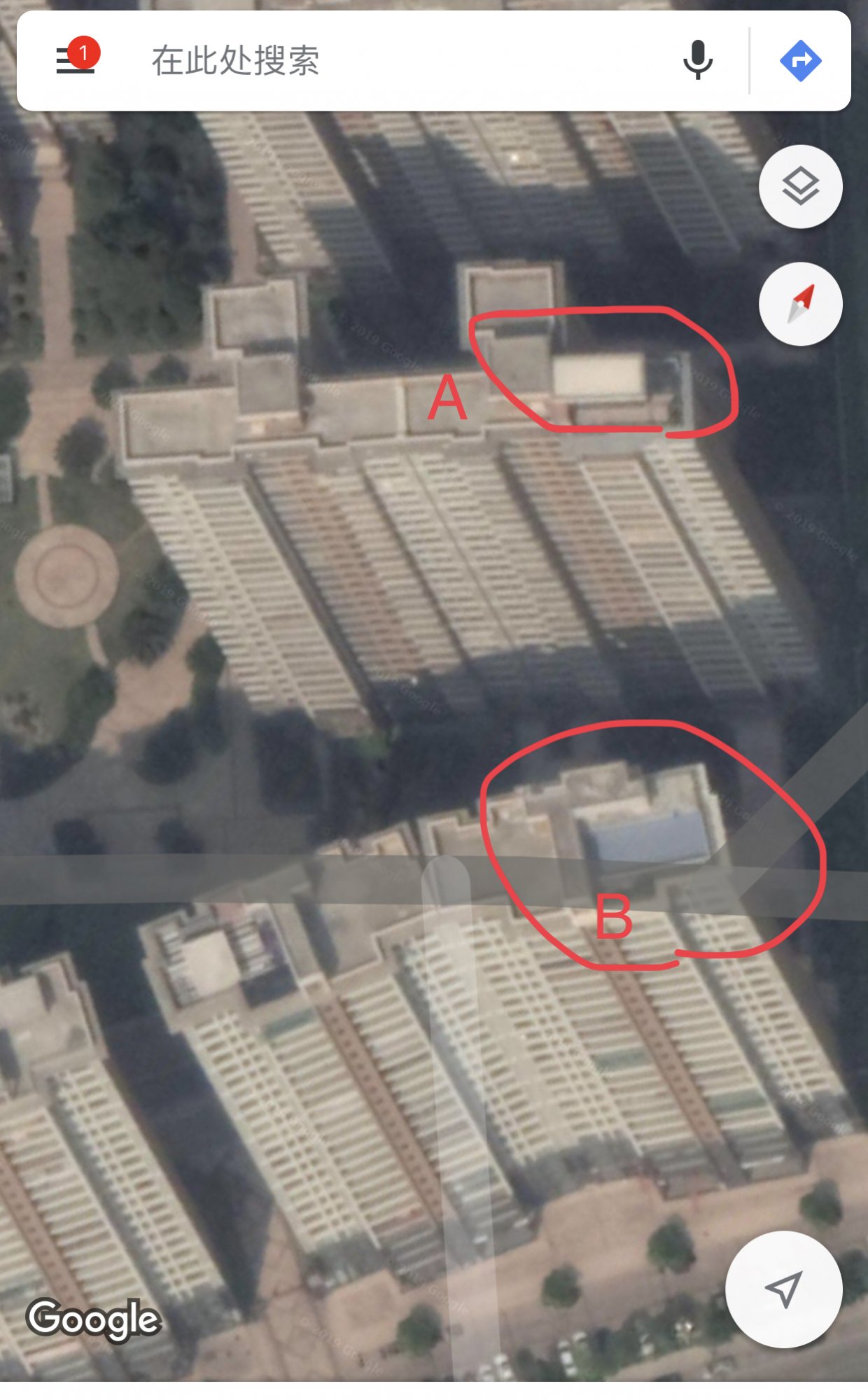从谷歌卫星地图上可见楼顶两处比较显眼的违建