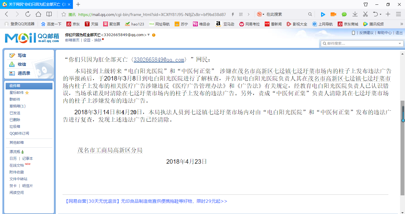 腐 腐败份子祸民 学前班 注册 2017-09-22 消息 67 反馈评分 5 点数 0 2018-04-27 #1 福建莆田系的电白阳光医院和茂名欧亚医院涉嫌发布违法广告被茂名市工商局高新区分局处置,但是不罚款,见图片证据茂名市工商局高新区分局的回复。请大家有空学习下《广告法》。 附件 QQ图片20180427101446.png 222.1 KB · 查看: 404 QQ图片20180427101747.png 210.9 KB · 查看: 416 QQ图片20180427101609.png 224.7 KB · 查看: 402