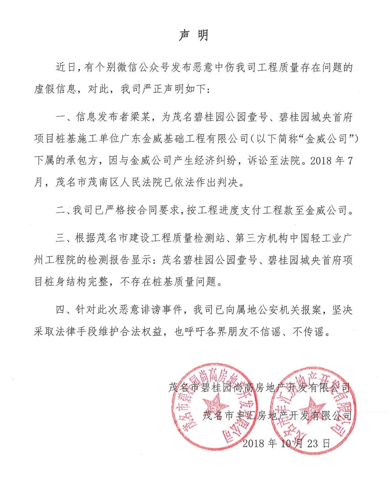 电小二 电白论坛小编一枚 版主 注册 2005-06-15 帖子 519 反馈评分 121 点数 41 所在地 电白 性别 男 2018-10-24 #29 碧桂园官方发出来的声明 这件事,告一段落!!!