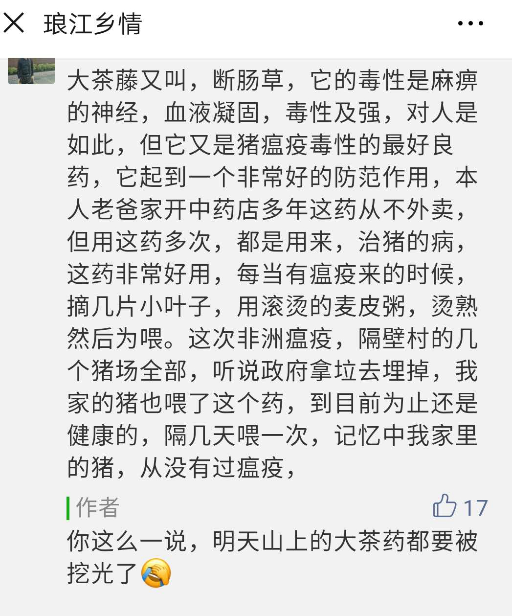 再顶下,让更多的人看下!多次听到这样的声音:“大茶藤能有效预防非洲猪瘟”。有说棋楠叶也有这种功效。没养猪没法试!