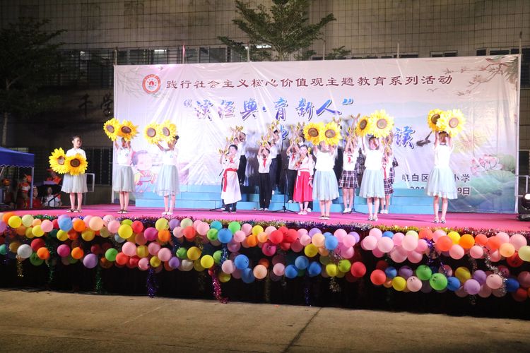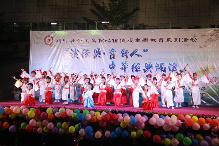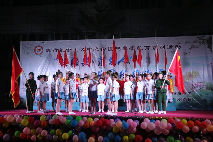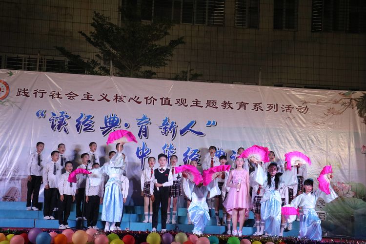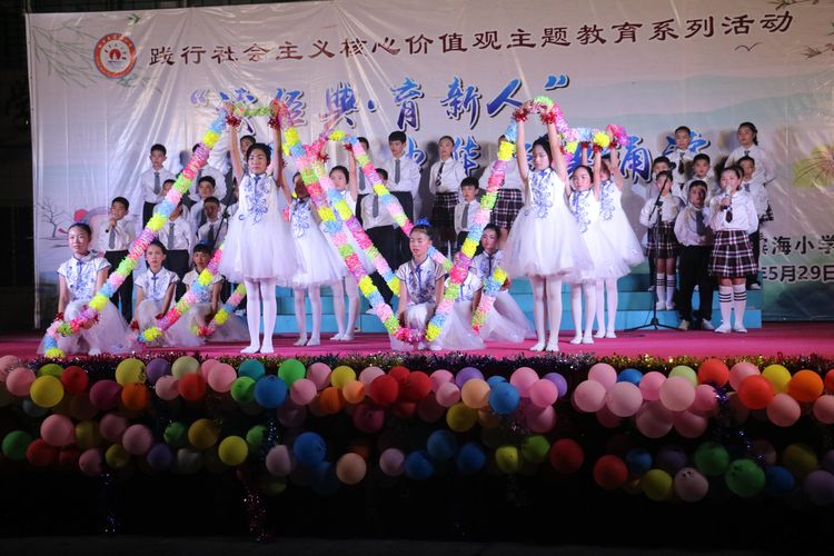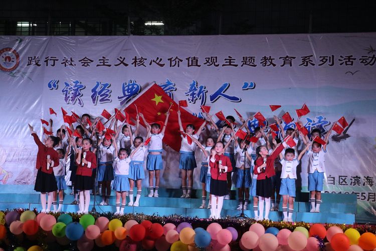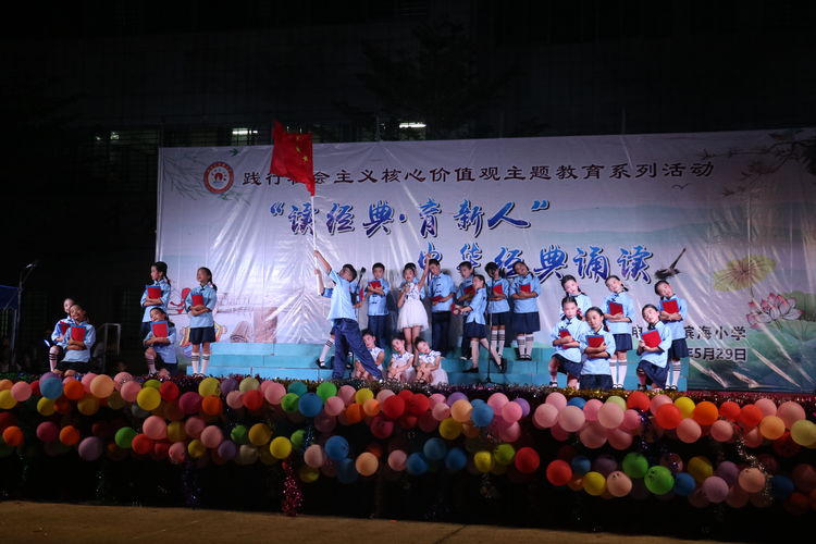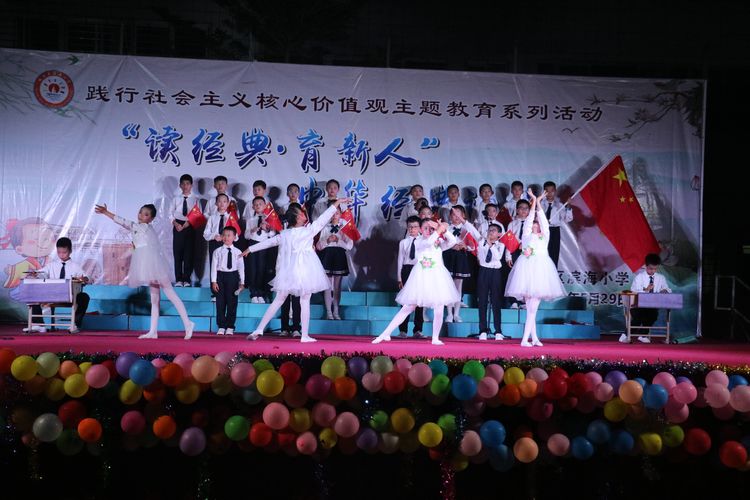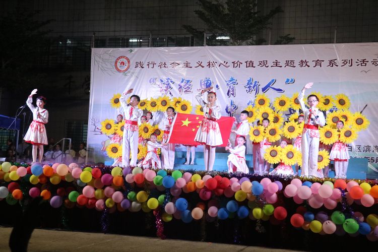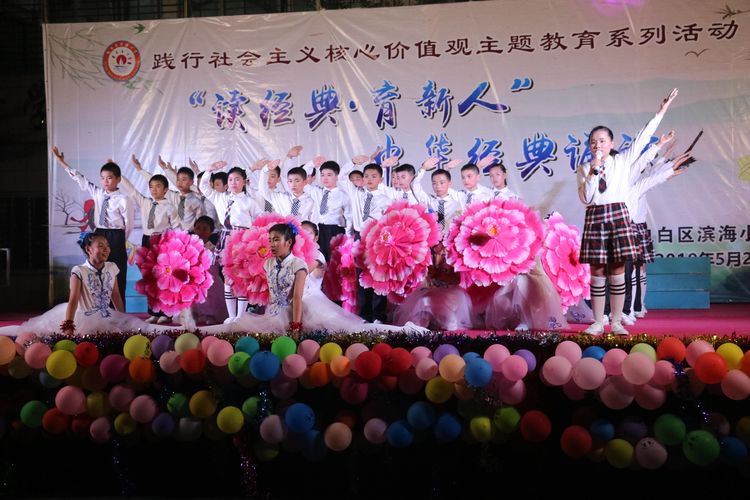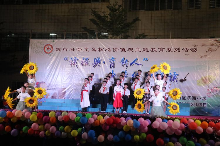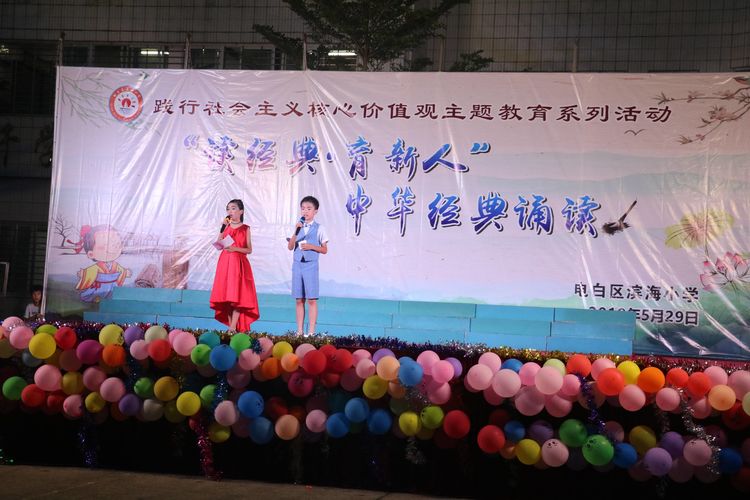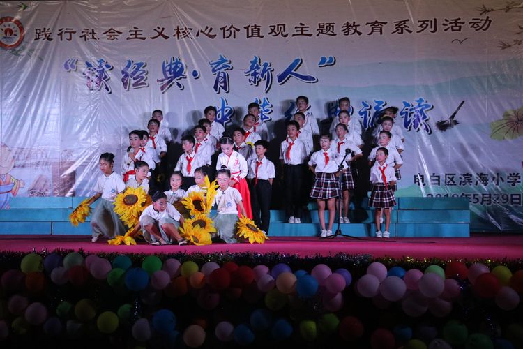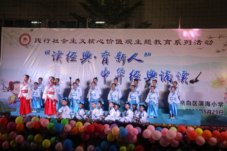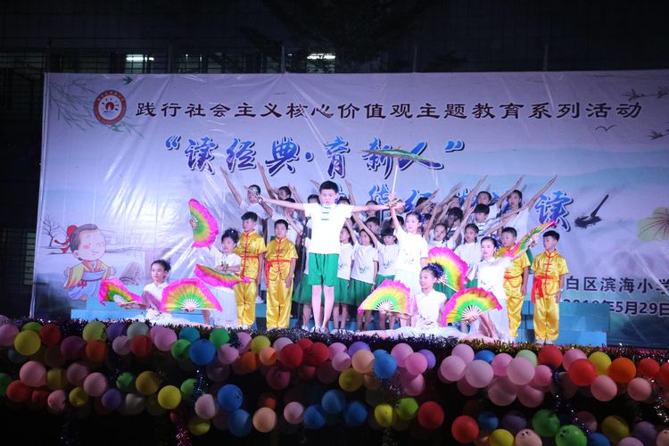 中国文化源远流长,博大精深。中华经典经久不衰,启迪智慧。为弘扬中华传统文化,践行社会主义核心价值观,庆祝“六·一”国际儿童节,2019年5月29日(周三)晚,电白区滨海小学举行了“‘读经典·育新人’中华经典诵读”晚会。电白区教育局党组成员、副局长唐少安同志,南海街道办副主任蔡玉娟同志,电白区教育局德育股股长陆小燕同志,南海街道霞里社区书记蔡标强同志,霞里社区领导干部等莅临指导。