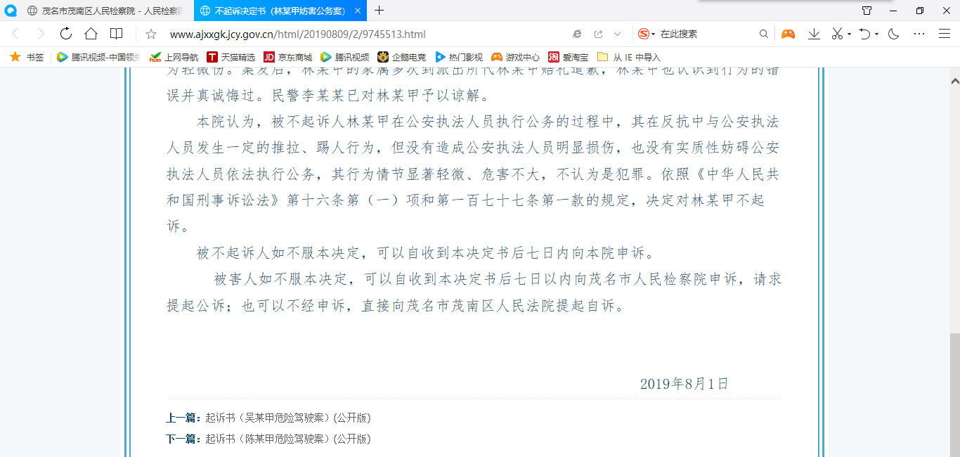 茂南开发区一饭店因结账发生纠纷问题报警导致的妨碍公务案对被抓者茂南区人民检察院依法不起诉,《人民检察院案件信息公开网》全文如下: