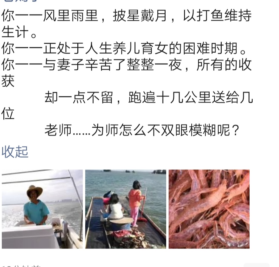 小池,一位开朗健谈,心地善良,勤奋励志的渔民,电白区寨头村人。去年起,把日常出海打渔的点点滴滴,拍了视频发到网上,在腾讯,网易,火山,今日头条等等视频网站上点击率爆棚,账号:渔农小池。在外国著名网站Youtube上面,更是每个视频都有十万以上人观看。逐渐有点小名气的小池现在依旧没有飘,来自全国各地,包括港台的同胞偶尔来找他,小池很热情地带他们去吃饭,不遗余力地向他们介绍电白这座海滨小城。小池文化并不高,在今天教师节这个特别的日子里,他做了一件很普通的事情来感谢致敬教过他的老师。 Screenshot_20190910_143439.jpg Screenshot_20190910_143534.jpg mmexport1568097370005.jpg mmexport1568097374482.jpg