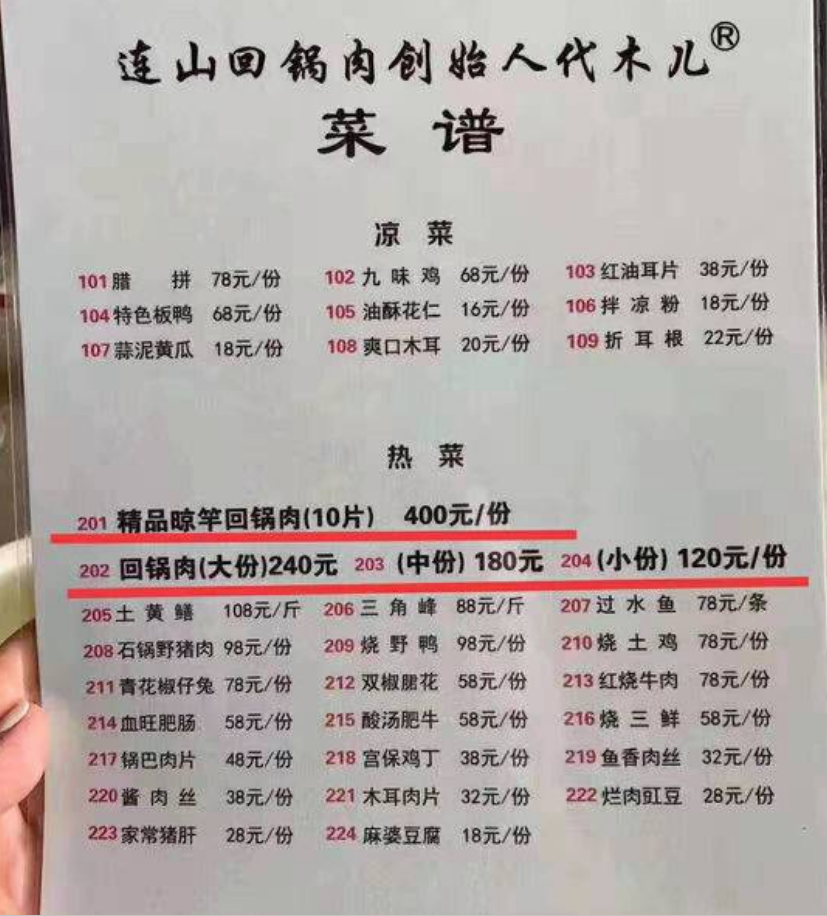 一 一笑 副教授 注册 2011-07-22 帖子 1,837 反馈评分 210 点数 101 2019-11-02 #15 通过网友晒出的菜谱可以看到,一份名为精品晾竿回锅肉(10片)的菜品,其标价为400元。热菜第二排的回锅肉,按照大、中、小份分别标价为240 元、180元和120元。 11月1日上午,封面新闻记者来到位于广汉市连山镇场镇,找到了菜谱所显示的饭店。随后,封面新闻记者电话联系到已经外出的负责人代梅。 “涨价大概是从4、5天之前开始的,之前一份精品肉,我们定价是在240元。”代梅说,他们使用的猪肉,和普通猪肉并不一样。为了保证菜品质量,猪肉都是由定点提供,此前,每斤猪肉涨价到了58元。 代梅告诉记者,这种精品晾竿回锅肉,虽然只有10片肉,但是每片生肉重量在4两多。制作一份10片,仅用肉就需要近5斤。由于成本上涨,她们也没办法,只能将价格定在400元每份。
