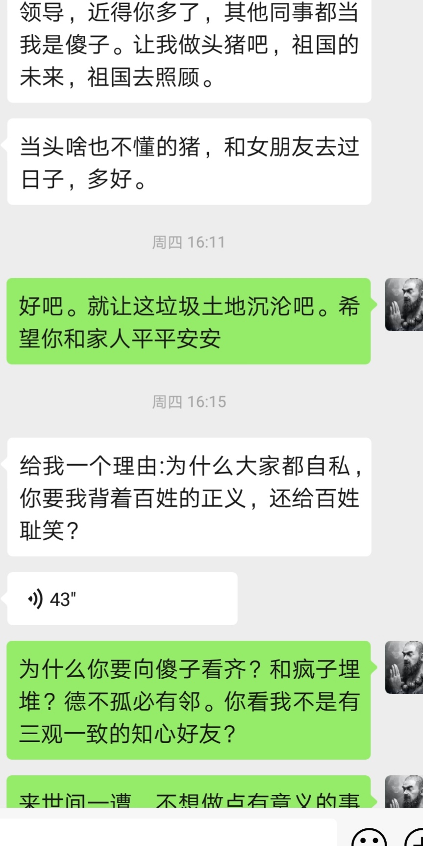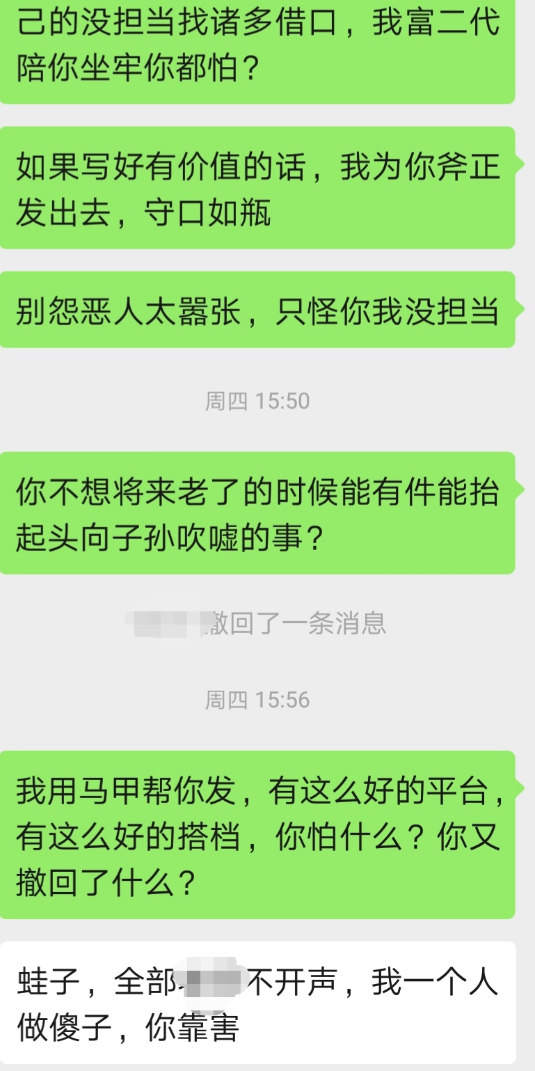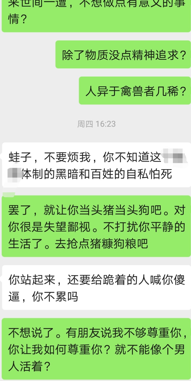 我现在连浪费点口水对猪狗说点正常思维的公益欲望都没了,曾加我的网友有的没有交流就删了,朋友圈也封闭了。说点真话却被别人当成怪物当成脑残,甚至反目成仇,多说何益?昨天有友对我说:他以前像头猪快乐地生活,因我的说教打破了他平静的世界。人人都那么自私冷漠,凭啥要他站出来要他担当?