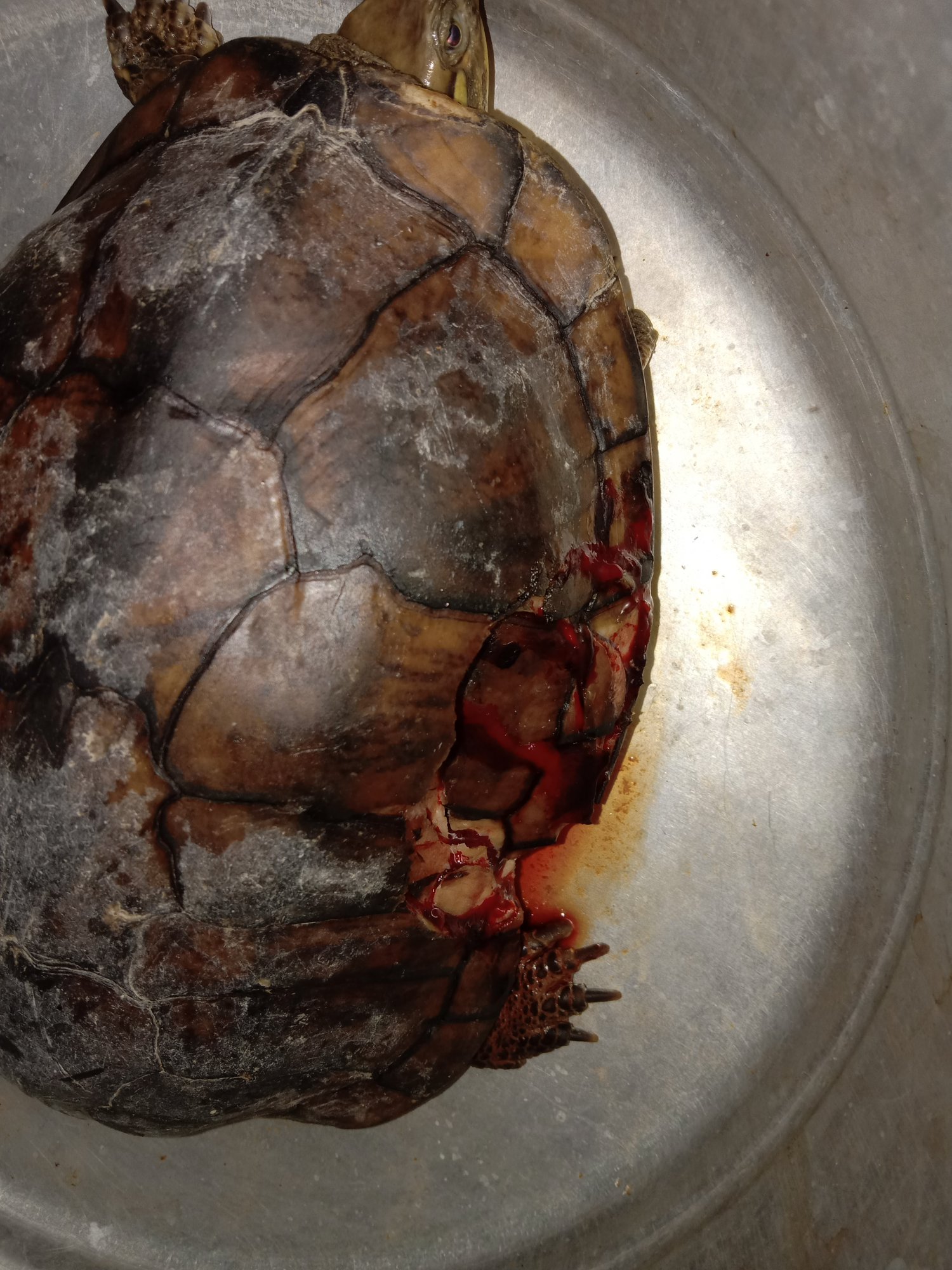 几月前,自池塘得一龟,四肢雄壮,鳞甲乌亮,有纠纠之姿。蓄之以塑料水池,应是自由驰骋已惯之故,至此桎梏,抗争激烈。先是绝食,继而乱咬池边,屡用棍敲之亦无悔改。昨,终于翻身而出,跌落楼下,摔得背甲残破,奄奄一息。倔强如斯,然何人能救?物尚如此,人何以堪!惟求上苍可鉴,全其性命,赐其自由! IMG_20191118_171000.jpg