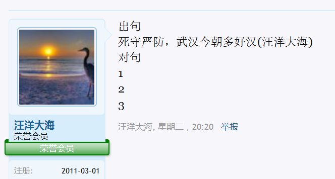 分享 出句 死守严防,武汉今朝多好汉(汪洋大海) (1人在浏览)