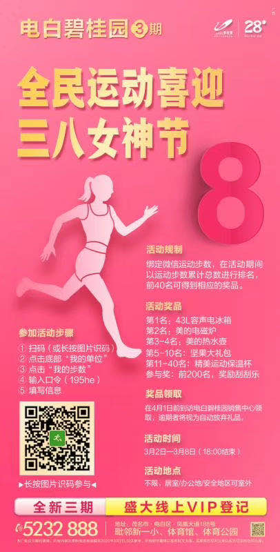 W w2365554 幼儿园 注册 2020-03-01 消息 12 反馈评分 0 点数 0 2020-03-02 #1 【电白碧桂园·3期】 全民运动 强体质 赢大奖 跑动喜迎三八女神节 电白人的都市生活大城 全新三期 盛大线上VIP 登记 联系方式:15626485034(微信同号) 附件 微信图片_20200302205335.jpg 57.8 KB · 查看: 399