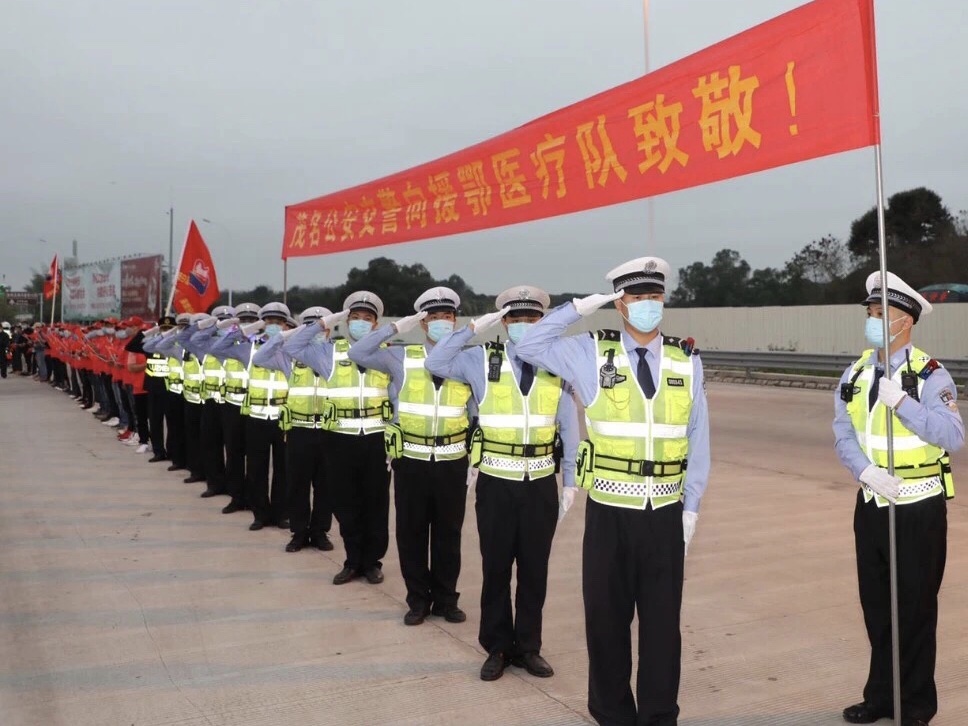 当护航医疗队的车队到达茂名电白出费站出口时,“敬礼!”伴随着一声口号民警、辅警以及志愿者列队向车队“立正敬礼”,凝视车队直到离开。
