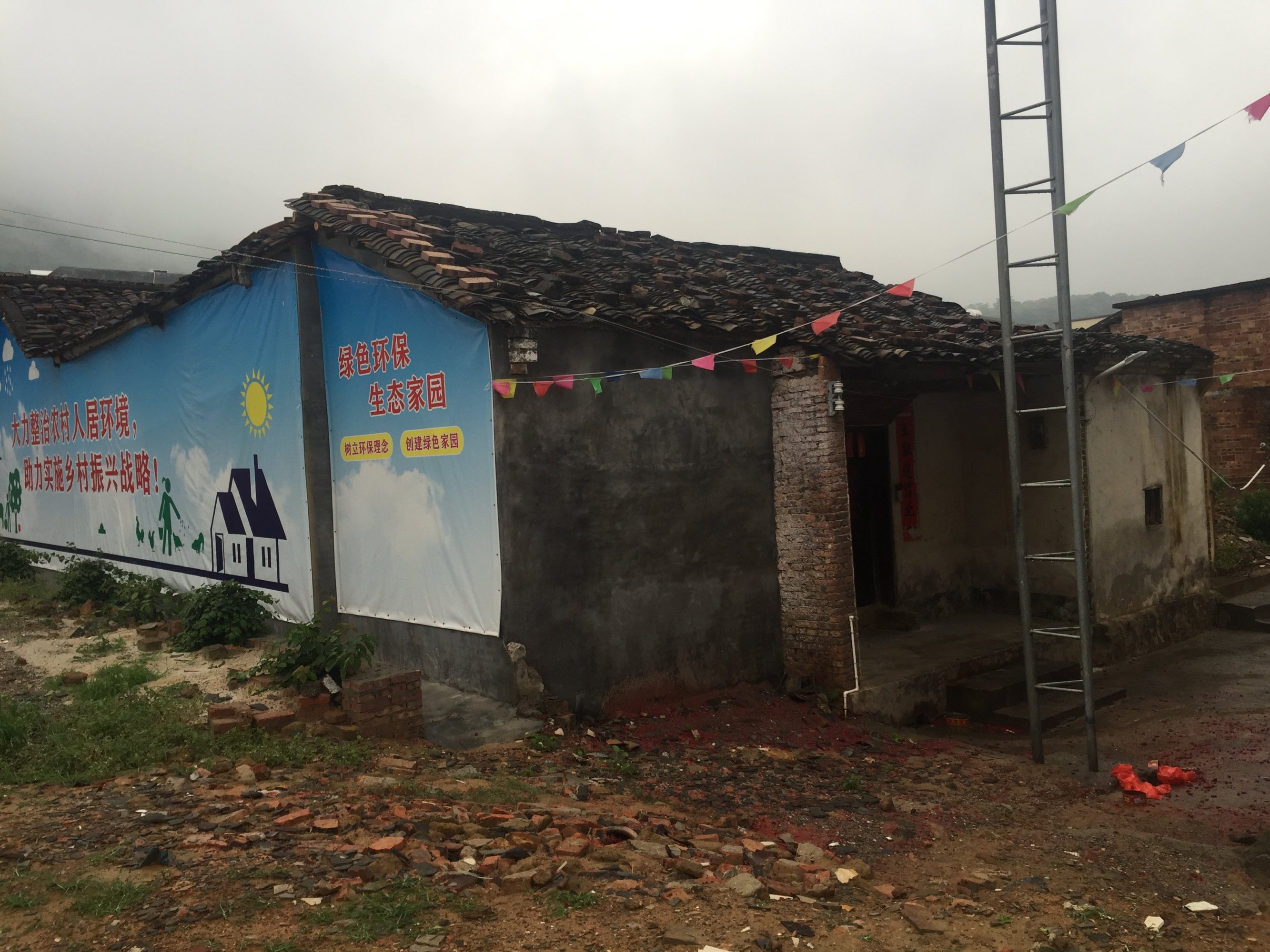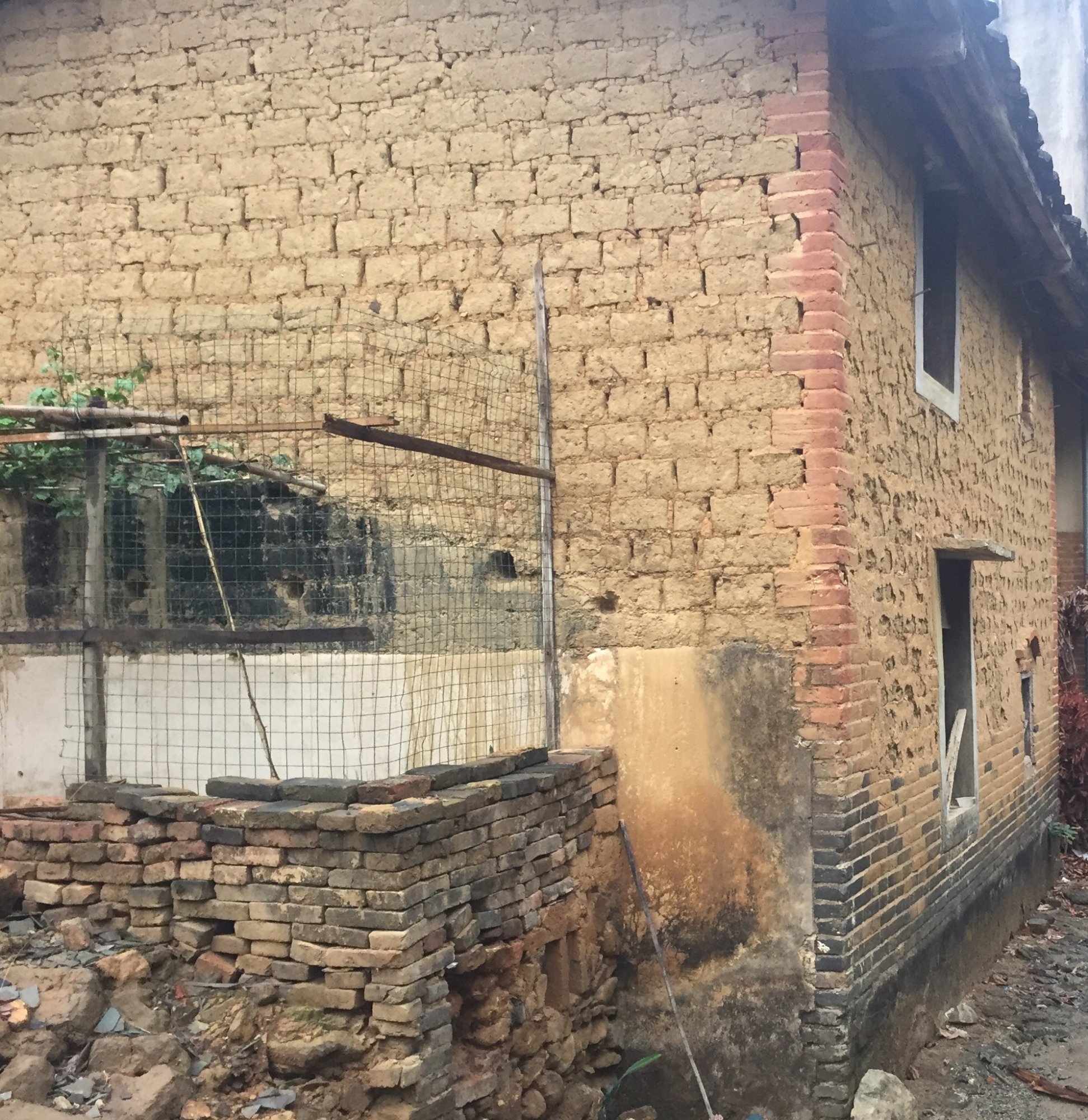 还有一栋最具代表性建筑风格的泥砖房没拆,建于清朝嘉庆年间,这栋建筑为即将离世的老人专用,离世后停放在里面的大厅供乡亲吊孝。初一十五乡亲们端着好菜好酒到此拜祖宗,尽孝心,年复一年,烟火鼎盛,八十年代村中的小孩子还在里面上课,里面很宽阔,房子的木材选料上乘,瓦面的木材是白木香,即沉香木,四五十公分的直径,大门是整块的龙眼木,几百年过去了,完好无损。