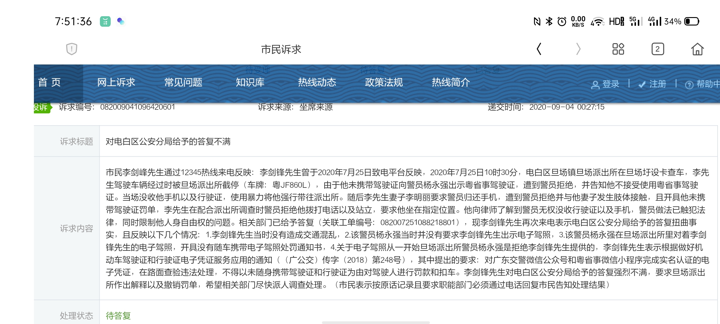 9月3号晚上,我突然想起可以通过短信中的受理编号可以查询12345的回复进度,然后手贱的打开查询了,惊愕的发现,原来早在8月27日就有网站回复了,但是,没有任何人联系我告知事件处理进度啊。详阅回复的内容,怒火中烧,这回复,关键情况,对于一众警员和警官的暴力对待,以及非法剥夺本人通讯权利,多次辱骂本人的行为避重就轻。但是对于事件经过,却扭曲描述。我随即再次拨打12345询问为何偷偷的网站回复,接线员告知,这是电白公安局回复的,我清晰的告知接线员,我不认可你们的回复,这是扭曲真相的,请立刻给我登记投诉。