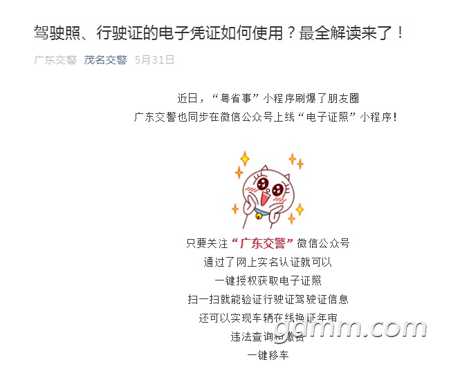 同时,2018年5月22日,广东省公安厅交通管理局发布在微信公众号 “广东交警”的标题为 《驾驶证、行驶证的电子凭证如何使用?最全解读来了!》的公告中,明确指出,民警路面执法检查驾驶人证件时,如出现驾驶人忘记携带实体驾驶证、行驶证的情况,允许其出示“广东交警”微信公众号或“粤省事”小程序里的电子凭证,民警通过PDA或经过系统核实后视为持有驾驶证、行驶证,不得以“未随身携带驾驶证、行驶证”为由对驾驶人进行罚款、扣车。