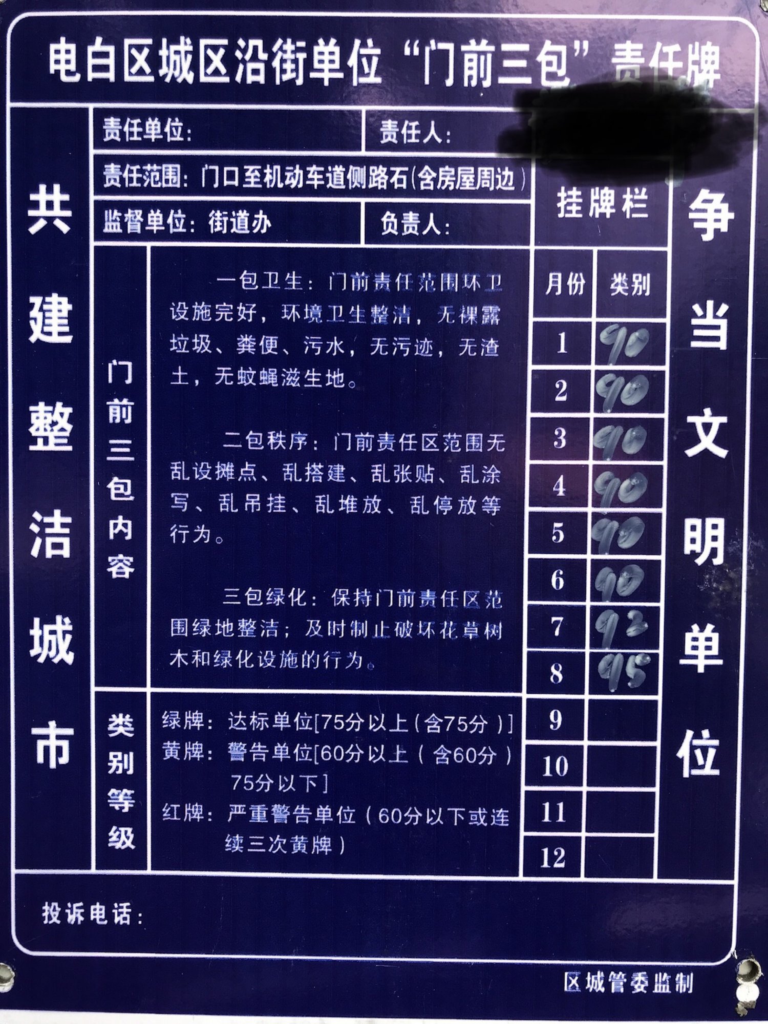 门前三包,举报部门和联系为何省略不印,这个不规范的牌子好意思贴,是谁主导这样违规操作应付双创? 严查时候你们办公室都不坐,挨家挨户去宣传警告,人家万把银租个档口做生意,你们这些人民养的渣渣又把停车位画到门口,不理不管,影响经营,电白形式主义简直不能再丑陋,好好检讨吧。