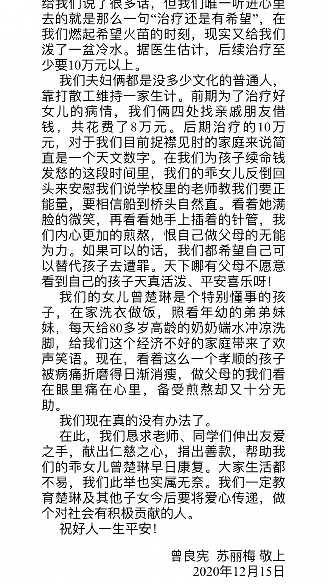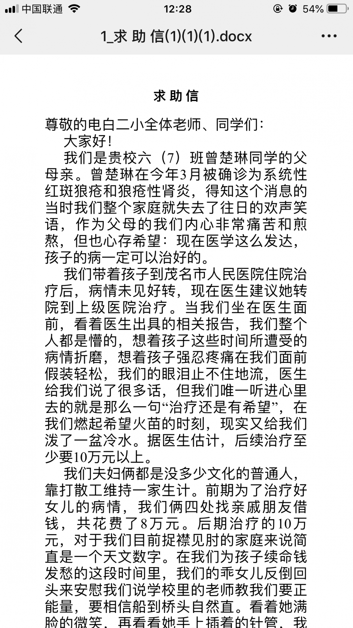 一份电子word文档,没有任何官宣。首先你学校牵头发起募捐,是否应该严谨一点。像现在社会一大堆轻众筹 水滴筹业务员挨个病房搞些业务的时代。起码人家都有具体病例介绍,能平台捐款,学校这样弄是否经过家访了解核实,人家是不是非常困难,你要给捐赠者感觉到你正规,有诚意在做一件好事。就甩个这样玩意出来叫各个班积极捐款,是让某些家长博爱表现?带头的五百三百,看谁捐的多吗,最后钱的去向做具体公布吗。