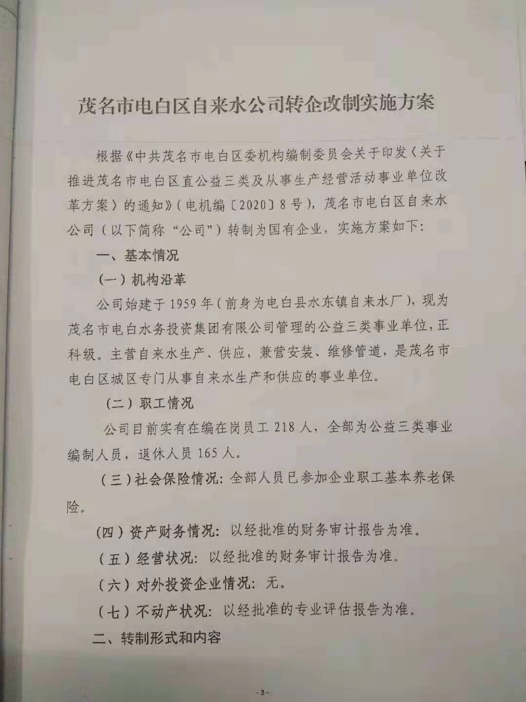 茂名市大电白区所存的事业单位里唯一响应国家政策。事业单位改为企业!事出有因:因在2014年咱们的已升迁刘区长已把电白区自来水公司偷偷承包给了北京首创集团!开始做出几个破产方案来赔偿给职工。可刚好国家来个事改企政策,这可正好借这个处理!