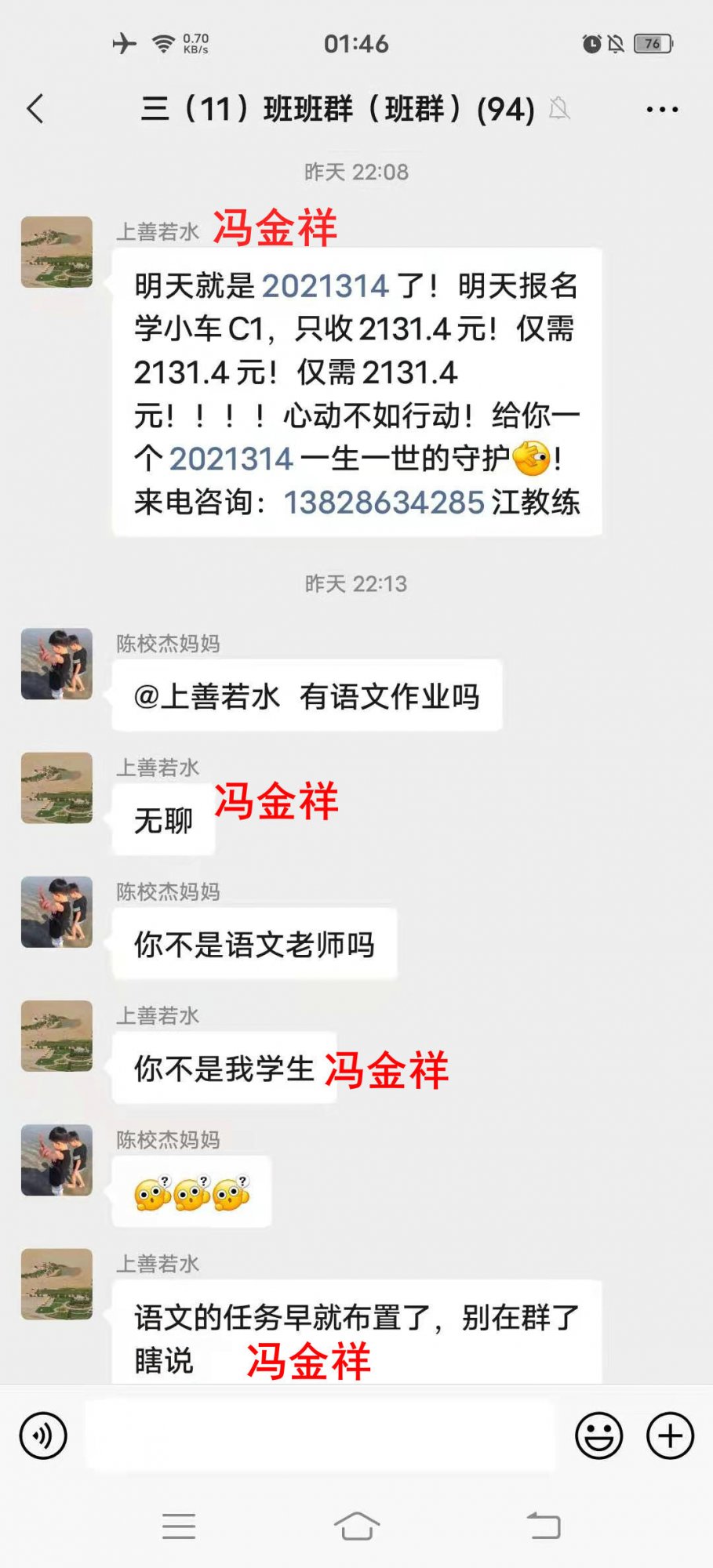闲望云卷云舒 说: 我揣测下,主要是因为楼主看不贯该老师在家长群乱发与教学无关的广告,然后那些发言主要就是从侧面来批评该老师不应不务正业,家长群当然是学生为主嘛,你乱发与群主题不符的广告难免令人某部分家长不满的。至于说到该家长故意设陷阱让老师下跳,我想这个未必是家长的初衷。 以上纯粹个人揣测 点击展开... 看一下回复语句用词吧,好像不是九小老师水平,楼主可能搞错了。