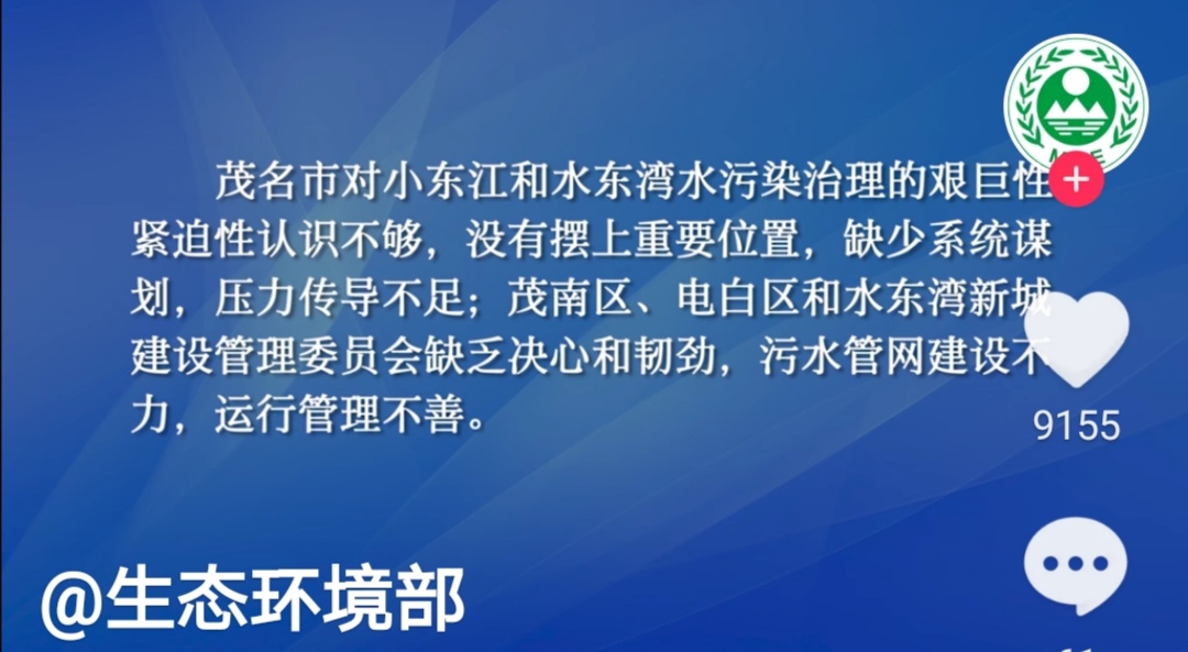 生态环境部:广东茂名治水工作不力 污水直排问题突出