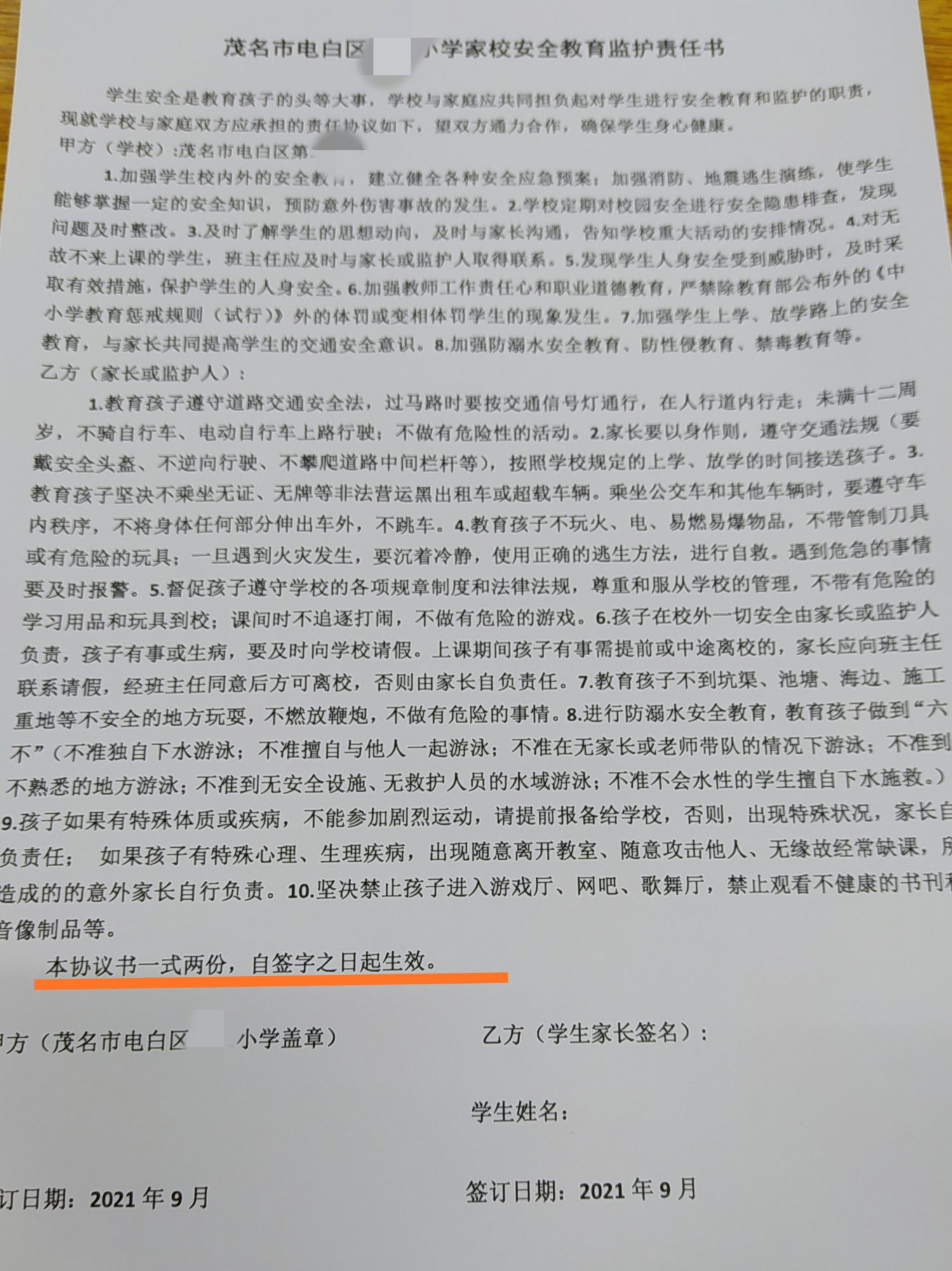 今晚家长会发了一分家长责任书给各位签名并收上去了,内容无非也是叫监护人管好自己孩子,外面发生事情自己负责。但是,你那个东西打印的时间是三月9月,显然不严谨。还有协议结尾注明是写一式两份,正常应该由双方盖章签名后各自保留一份,学校却只发一份并无盖章的给家长们签名,然后收走,假如有什么冬瓜豆腐,那会不会是一份连印章都没有的无效协议呢。