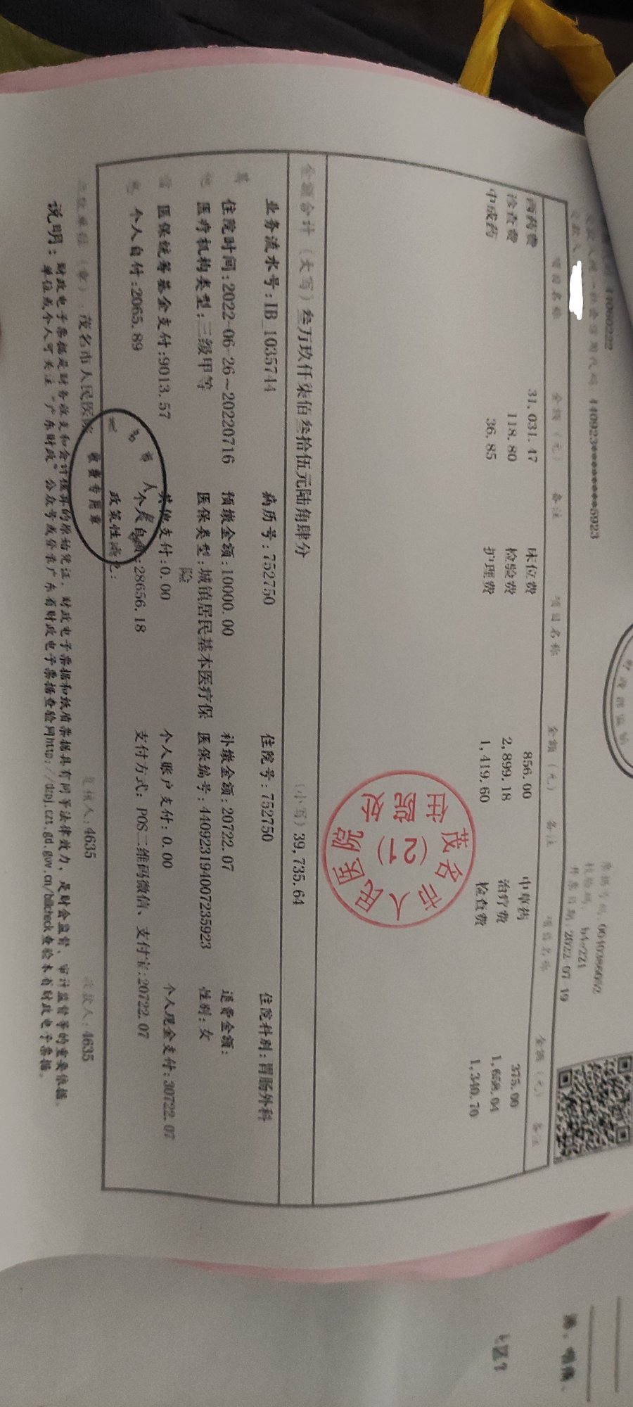 蓝轩 说: 估计不算二次报销。符合条件报销的话,医院很乐意帮你报销的,再问医保局拿钱的。 具体,你咨询下,茂名市医保局或电白医保局,看我发的医保机构联系方式和地址。 按你的发票图: 医保统筹基金报销了9013.57元(大病标准的起付标准是9500元,未达标),个人自付2065.89元。个人自资:28656.18元。 点击展开... 谢谢,医保不是说没有好处,就算报销50%都可以减轻很多负担了,核心问题是治疗费根本没有达50%的报销,问题出在哪里?问题出在医院,很多用药都是需要个人自费的,不能纳入医保报销.......这是一个水深的东西。