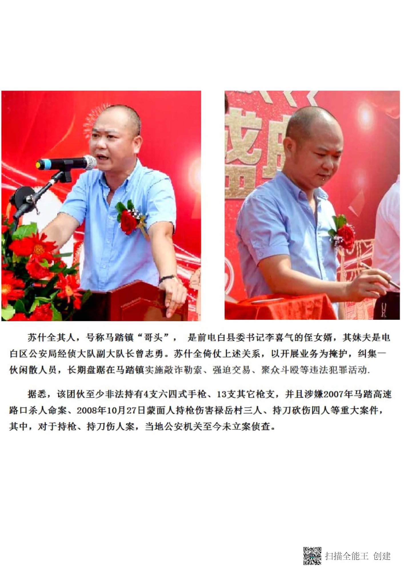 据群众反映苏十全其人,马踏“哥头”,他的头马“傻哥”,被判刑又出来了!其中2007年在马踏高速路口杀人致死命案关联,多起枪案有关,马踏这个团伙有四支六四手枪和十三支其它枪支至今没有被没收!2008年10月27日蒙面持枪伤害禄岳三个人和持刀枪砍伤四人,当时那四个被砍得如此重伤,当地公安没有立案!苏十全是原电白县委书记李喜气侄女婿,妹夫是电白区公安局经侦大队副大队长的曾志勇,是马踏促进会主要成员,现在在珠海经商。