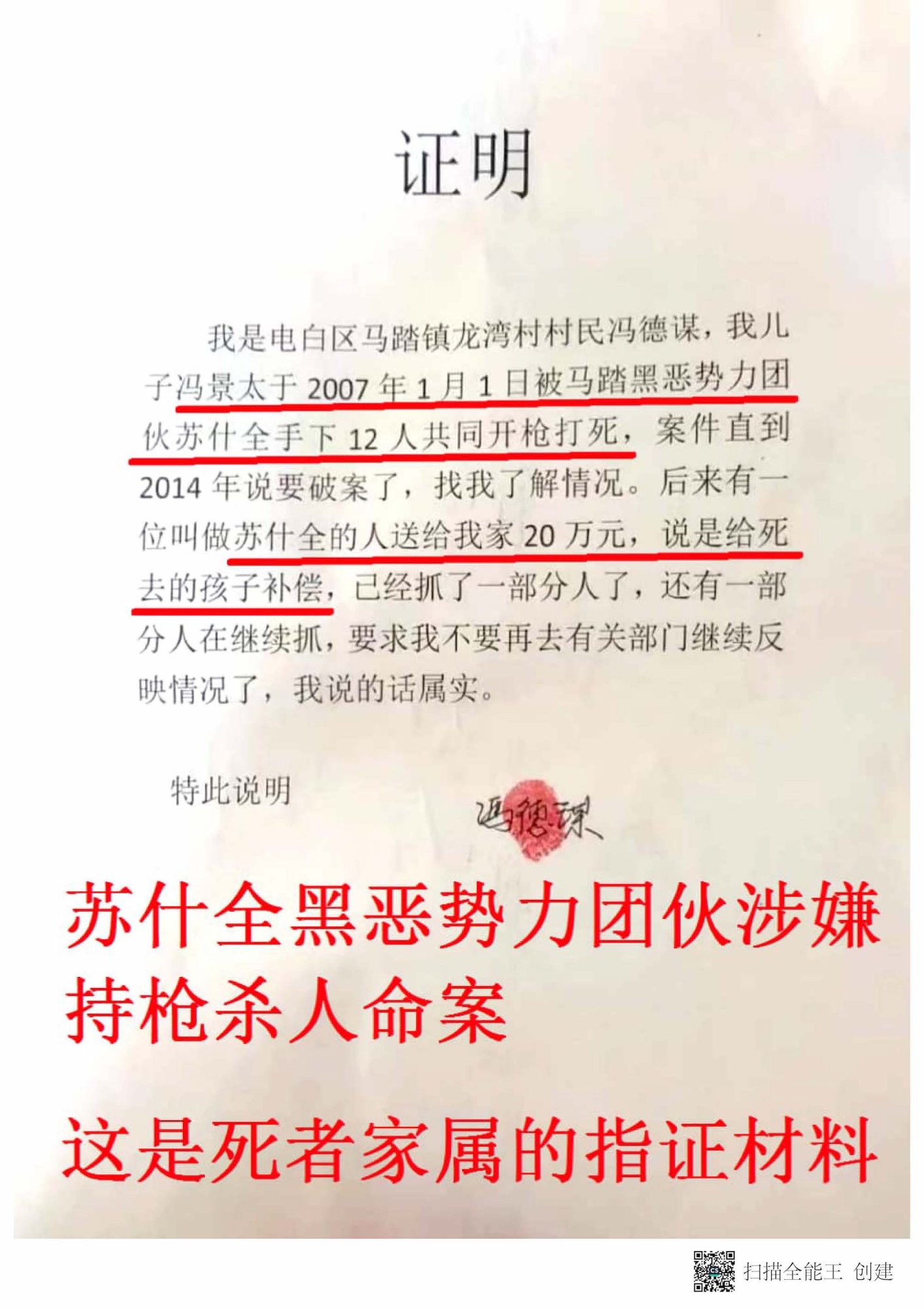 最后马踏镇政府的《请示》报告把许李全列为马踏黑恶势力帮派头目交给了马踏派出所,这份请示书一直在案件卷宗里面,我是从省高级法院复印出来的……