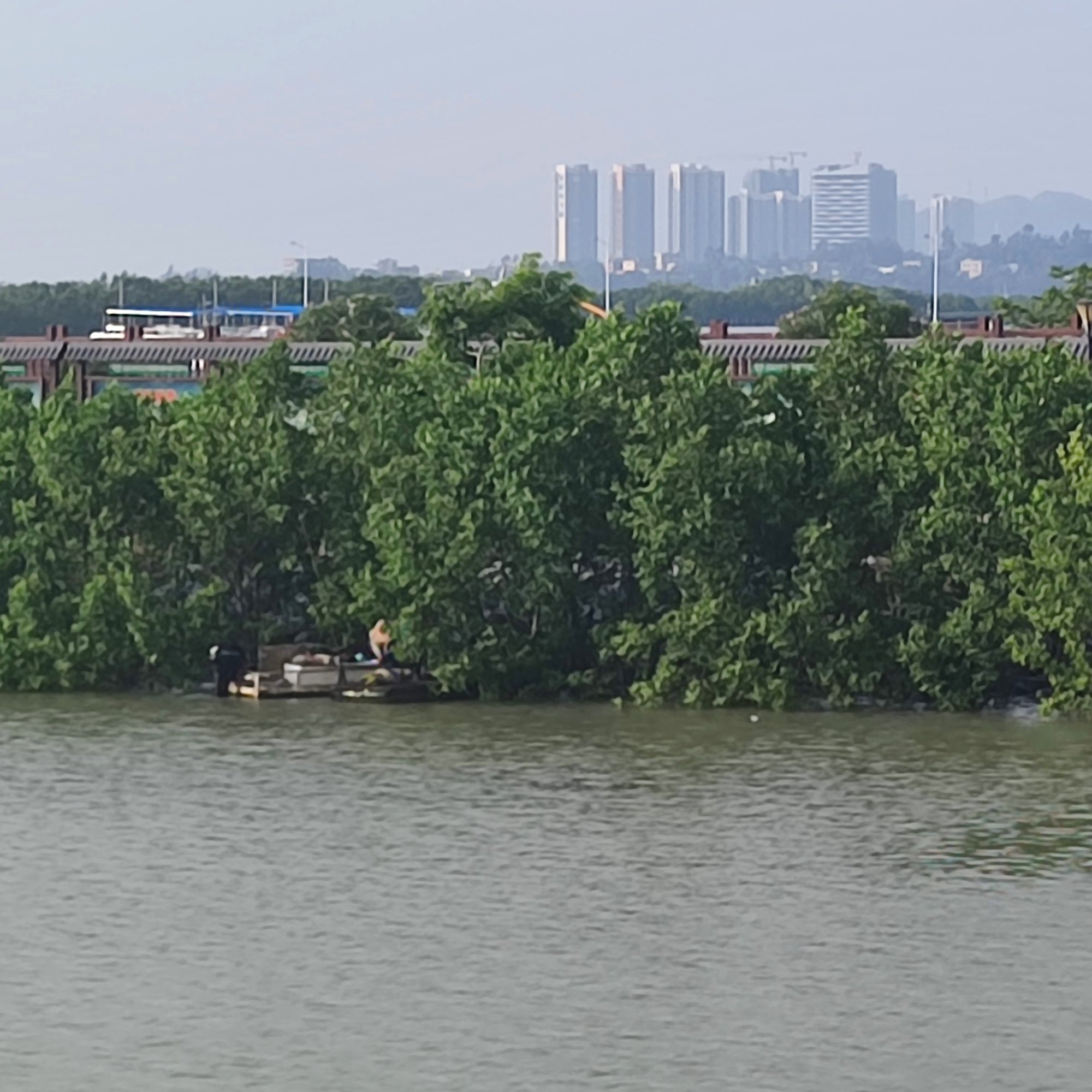 涨潮好像见有人撑船在清理垃圾…?